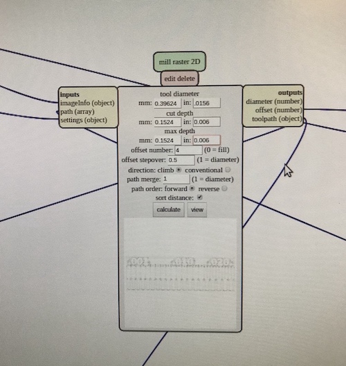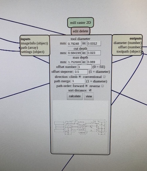 Cut depth is the depth of the machine in each turn and max depth is the maximum depth the milling to get to. In this case, the machine will cut only one layer of 0.006 inches to make the engraving. The other settings which are important are ‘offset number’ (which is the number of lines the machine will make) and ‘offset stepover’ (which is the witdh of each of the passes). When clicking on ‘calculate’ the file is prepared for the milling. In ‘view’ it is possible to see the actual path that the machine will make.