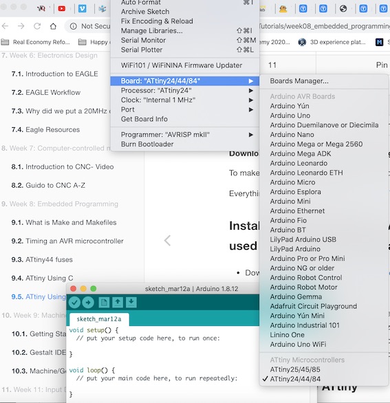Once all these are installed, I can select ATtiny by going on “Tools > Board” menu.