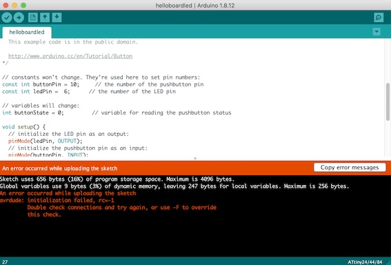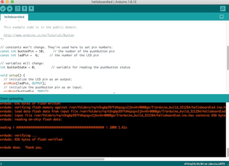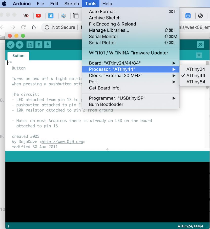 The tutorial also said to change the clock to ‘external 20MHZ’, since we have an external 20 MHZ resonator on the Hello Button + LED board. And I also changed the processor setting from ATtiny24 to ATtiny44.