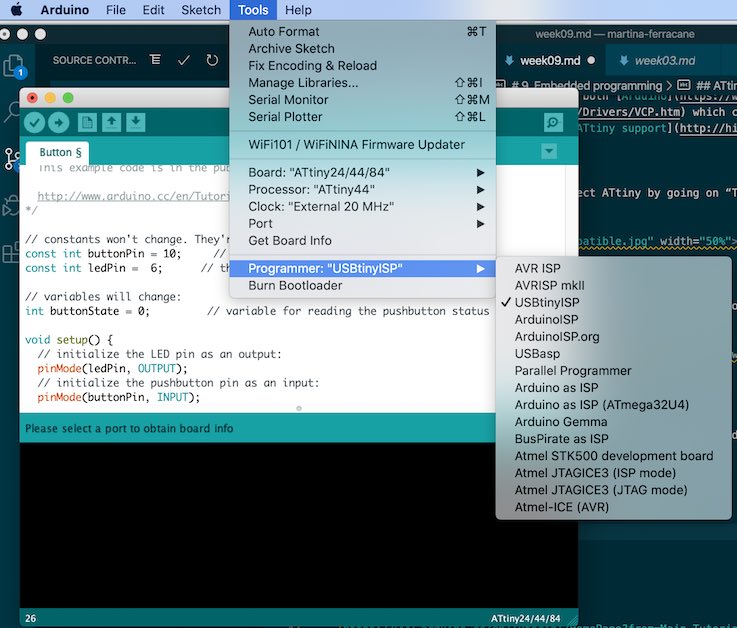 I followed mainly this tutorial to do embedded programming of ATtiny44A microcontroller with the Arduino IDE. I used the Hello Button + LED board created in week 7.