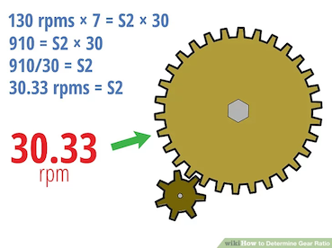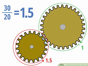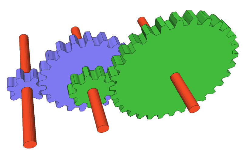I had to figure out how to calculate compound gear ratios.. I followed this tutorial. When a gear train has multiple stages, the gear ratio for the overall gearing system is the product of the individual stages. For example, for the gear at left the blue gears are 7 and 21 teeth, while the green gears are 9 and 30 teeth. Thus, the first gear ratio is 7:21 and the second is 9:30. Multiplying the two together gives (7x9):(21x30) = 63 : 630, which is 1:10. So the big green gear will make 1 turn for every 10 turns of the small blue gear.