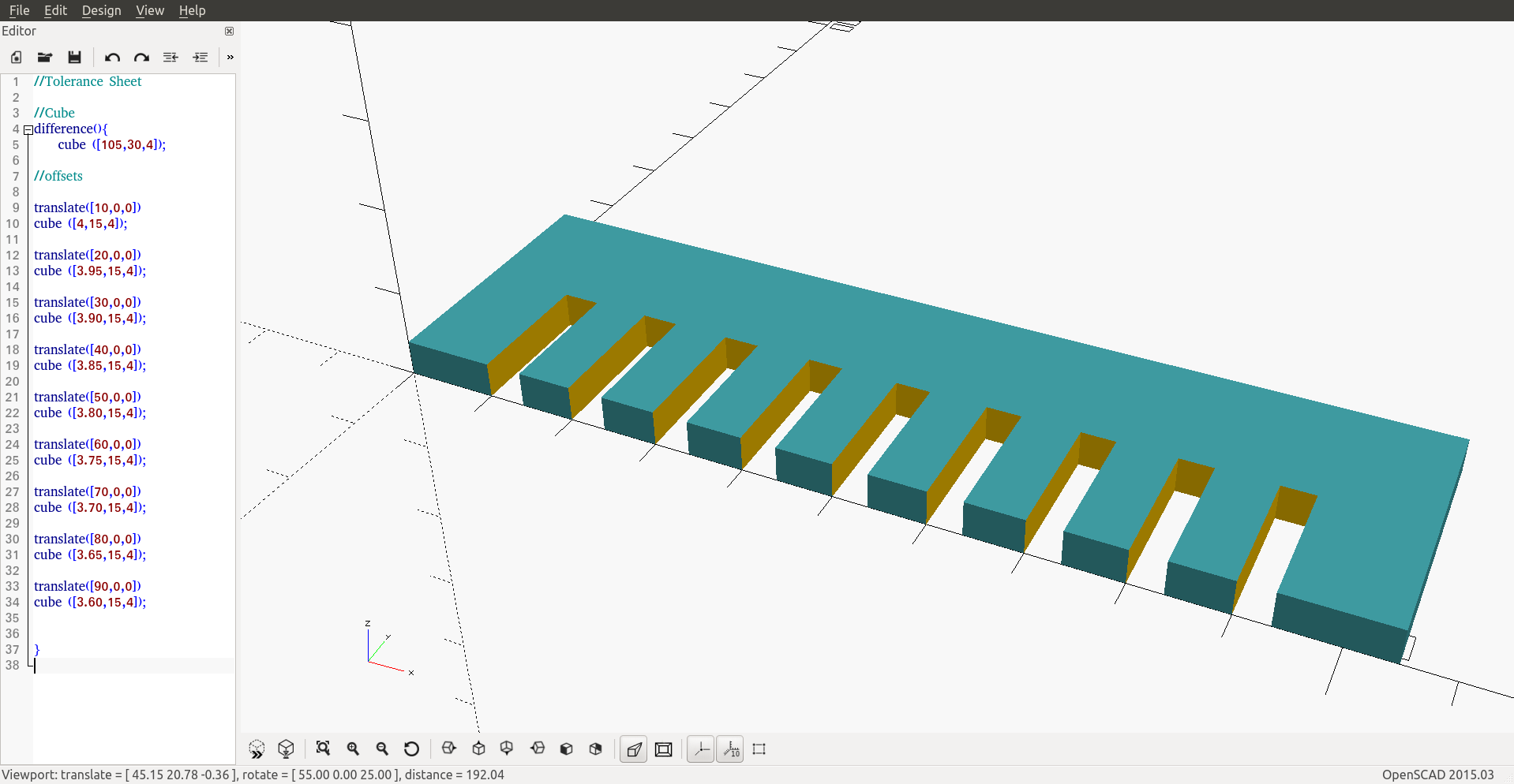 I used simple commands to create a test comb, the commands I used are cube, translate and difference.