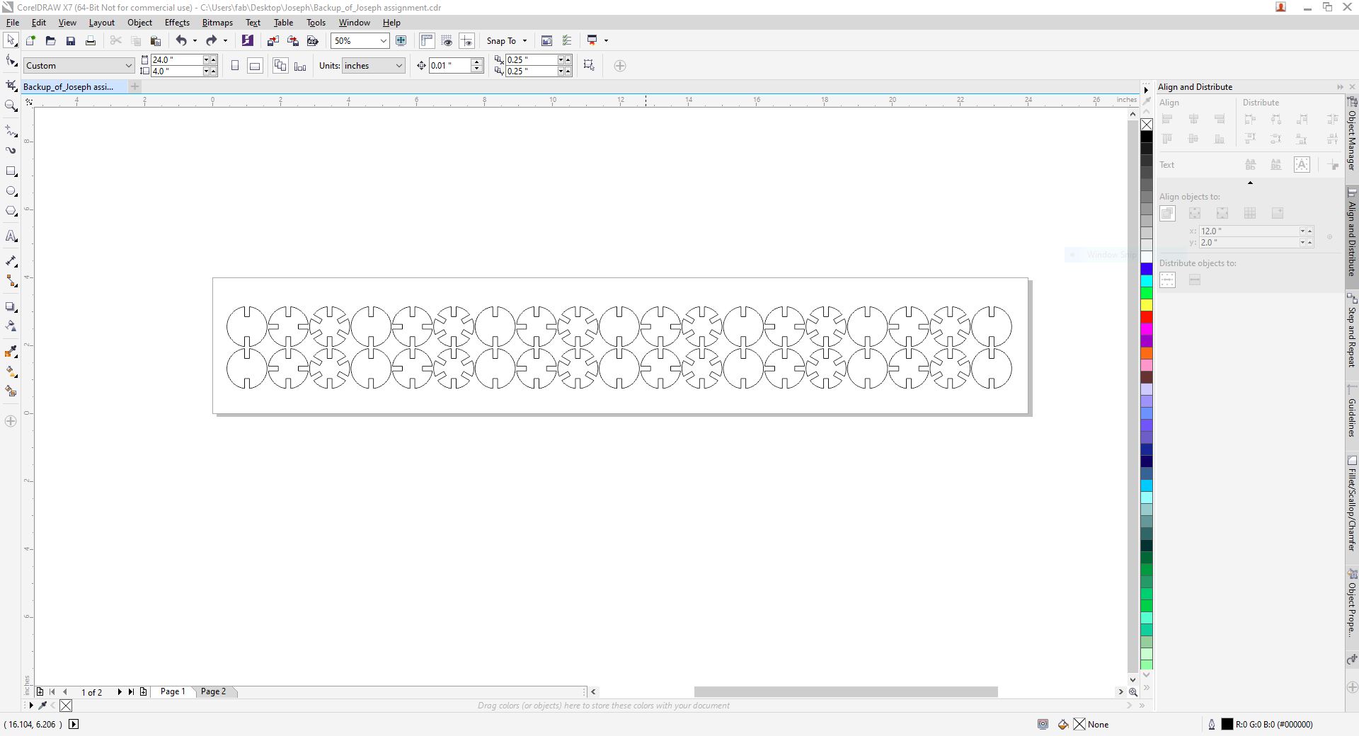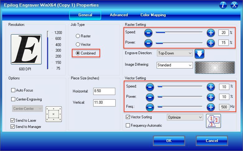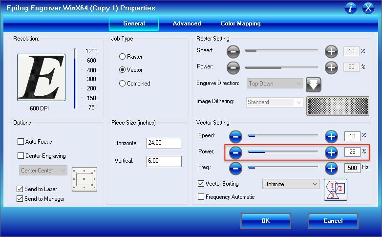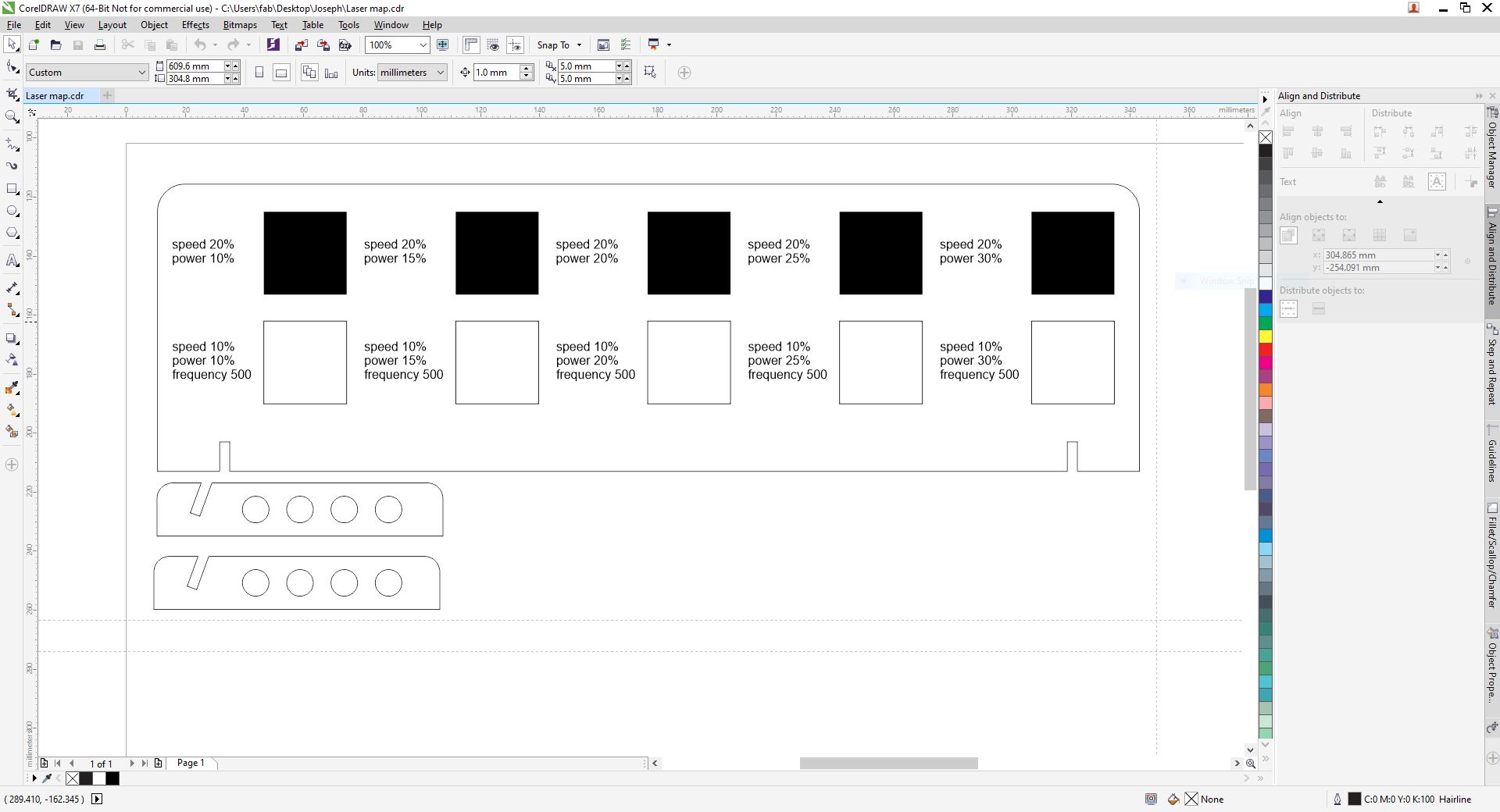 By adding the values to Corel Draw one by one we were able to determine the right power for the material.