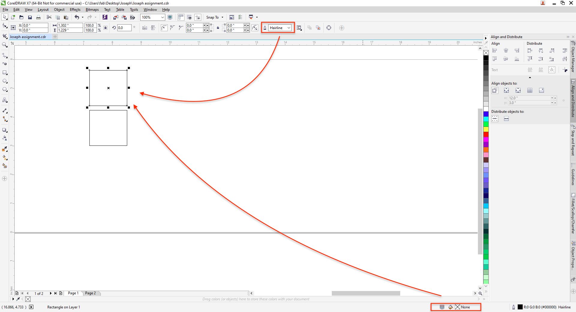 We want to create a range of tests with speed, power and frequency by drawing an object and values, a test sheet. For cuting an object you need to select the outline width to Hairline and for engraving by selecting a Solid Fill to the object.
