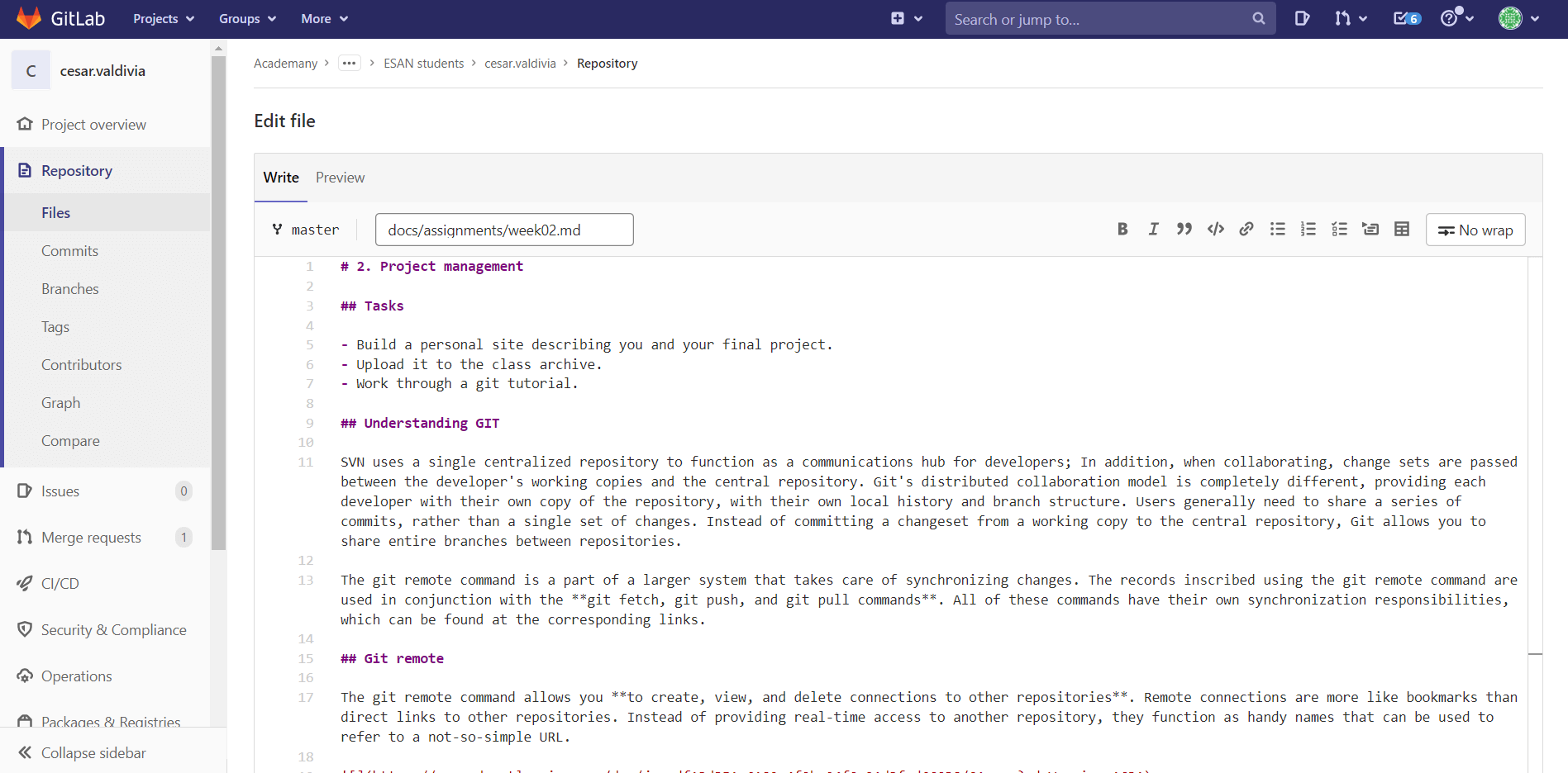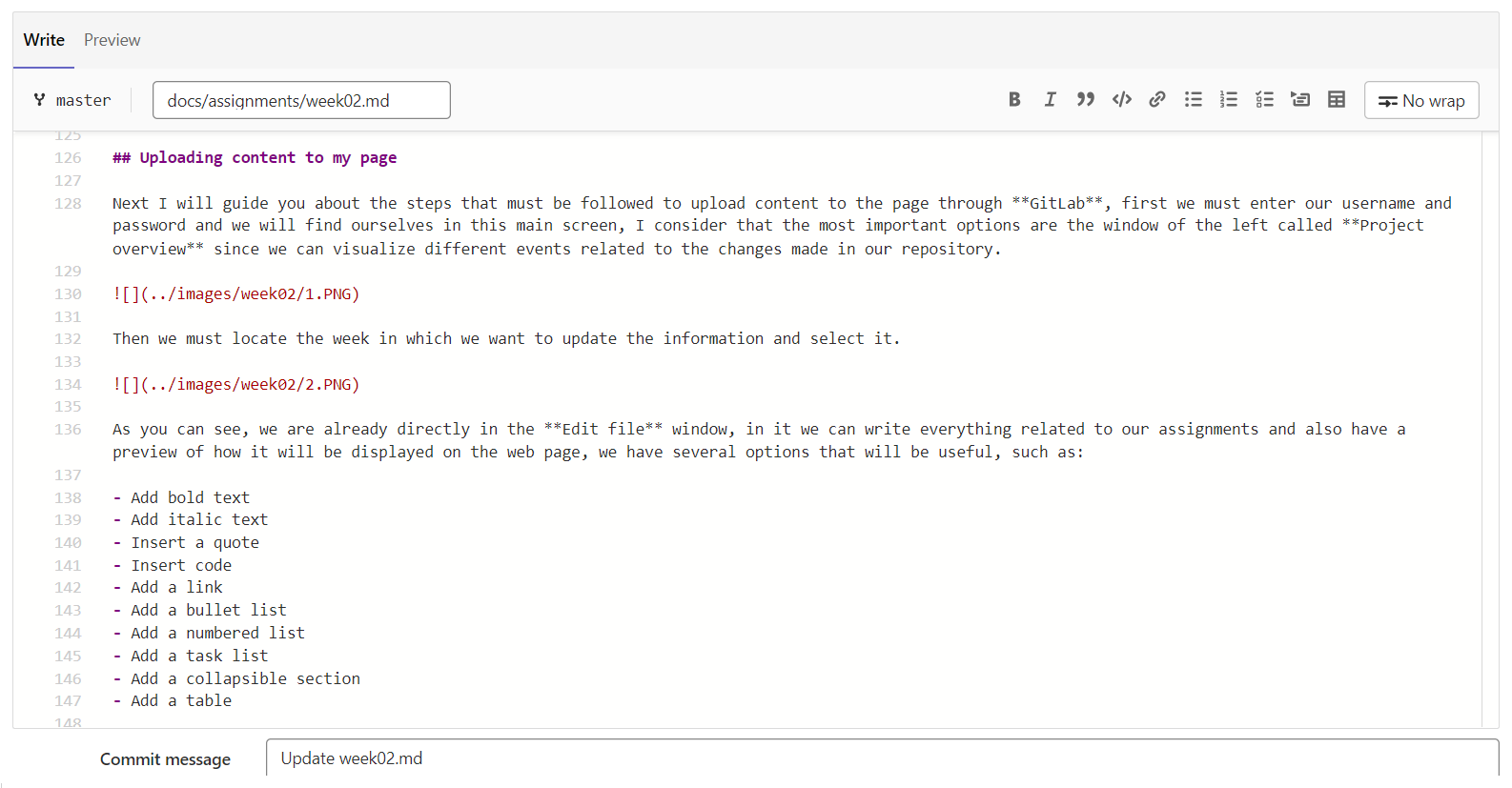 As you can see, we are already directly in the Edit file window, in it we can write everything related to our assignments and also have a preview of how it will be displayed on the web page, we have several options that will be useful, such as: