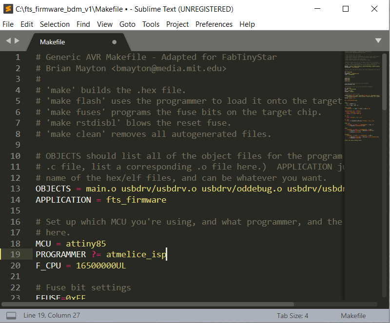 Everything went as expected without the need to use Zading as the Atmel programmers were automatically installed together with Atmel Studio as the tutorial indicates (but that didn’t really happen), I was having problems when loading the .hex file to the board, then I realized that I had to indicate the programmer I was using in the Makefile.h file, using an editor like Sublime I was able to edit that line of code with the correct name from the programmer I am using a White box with blue stripe: atmelice_isp.