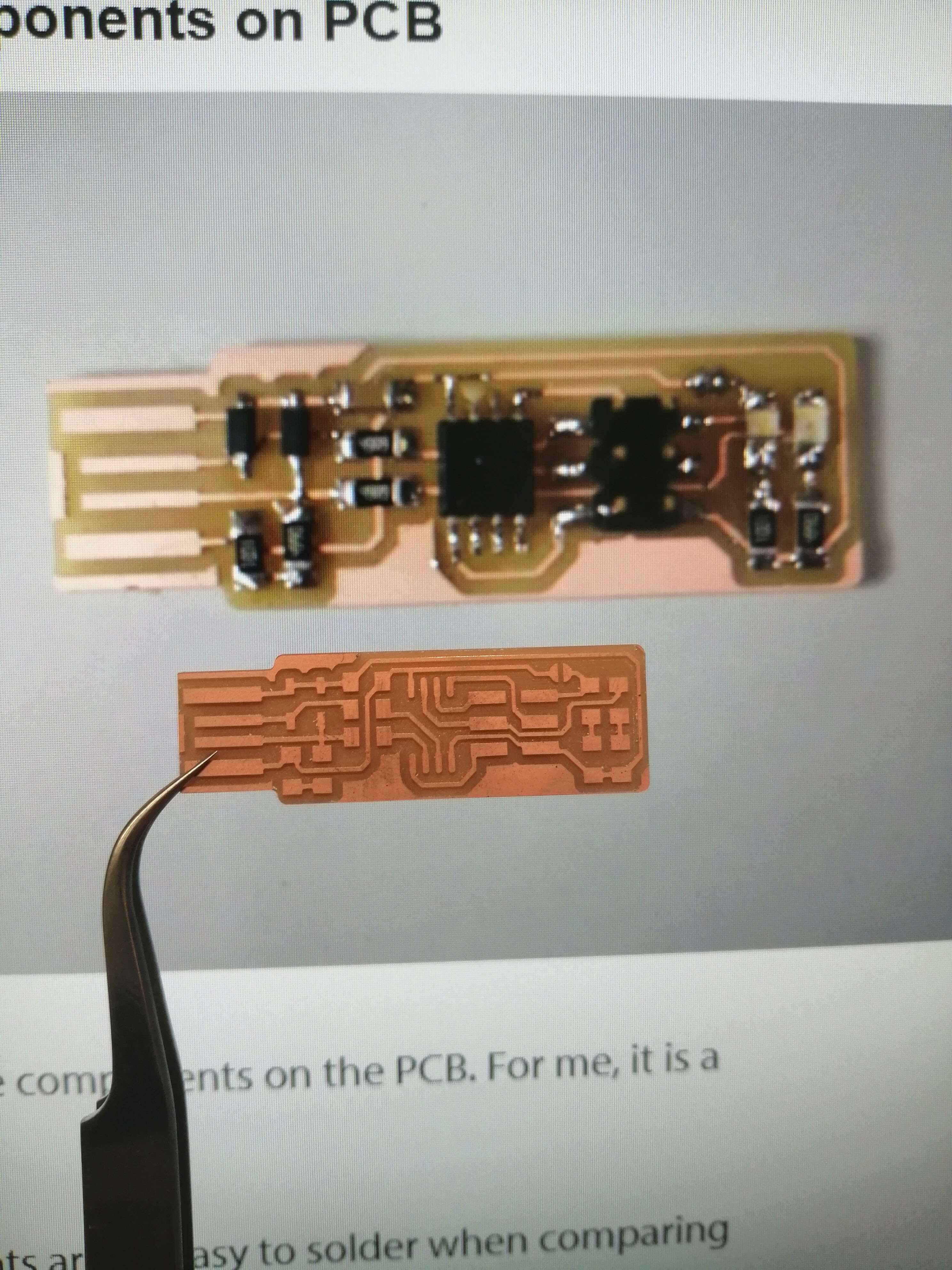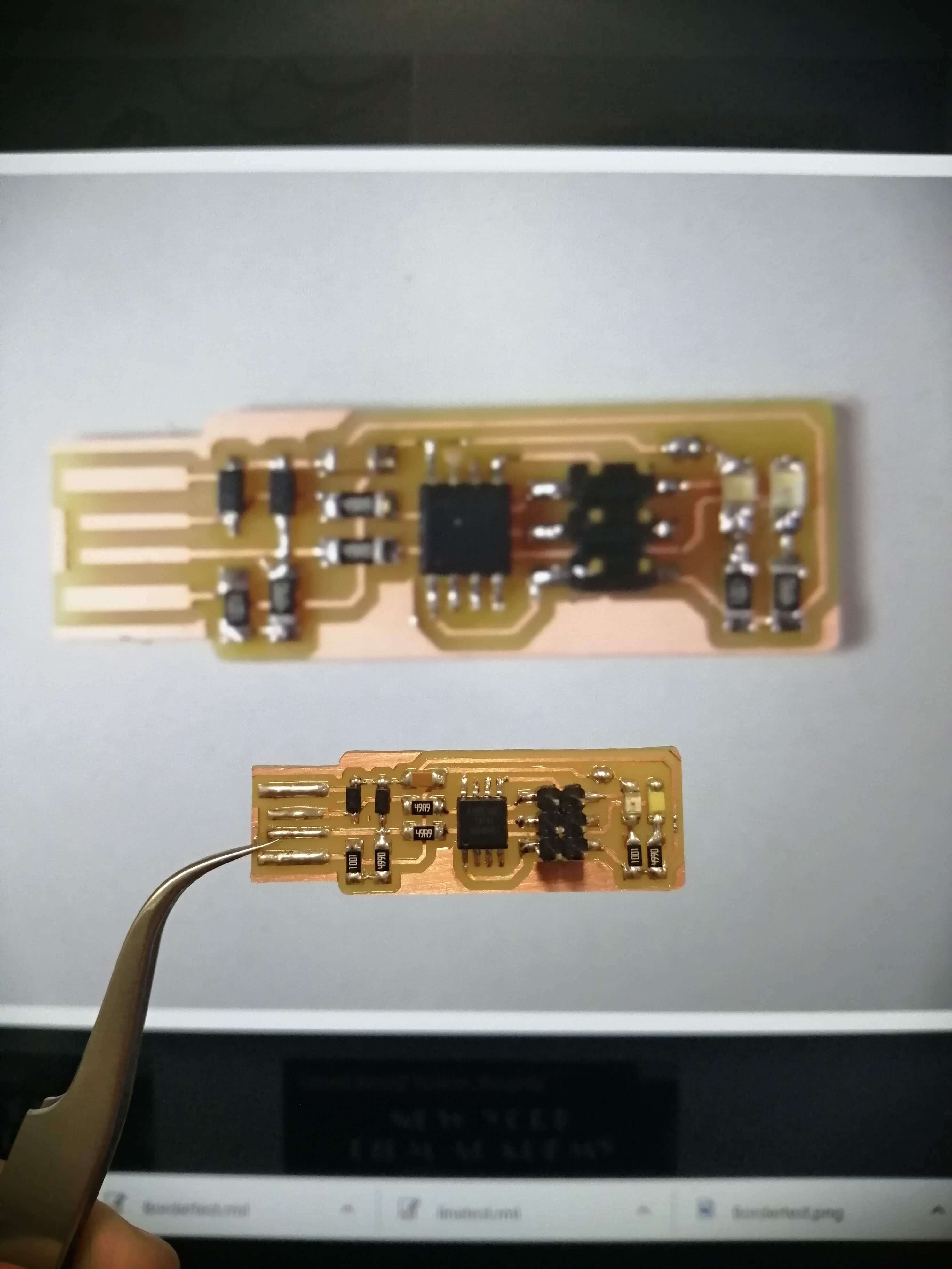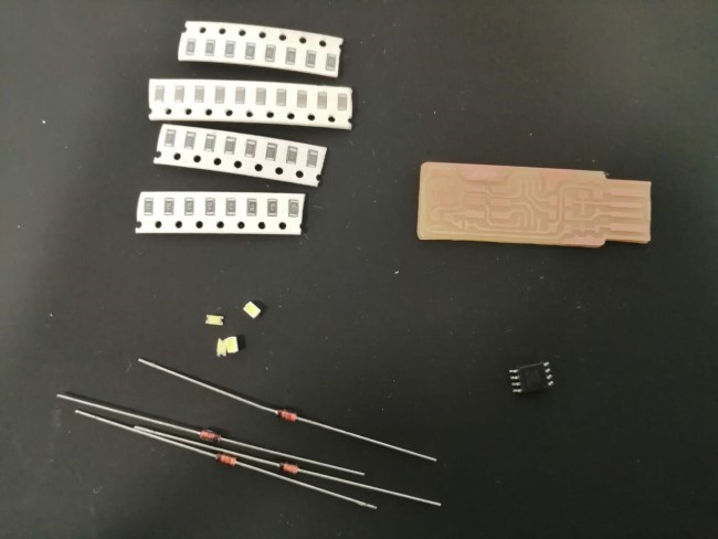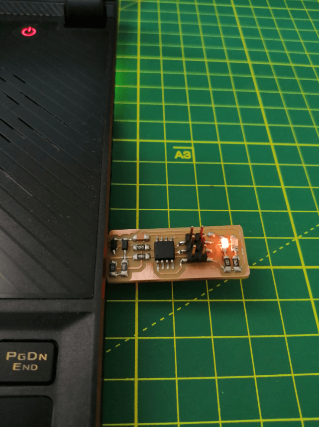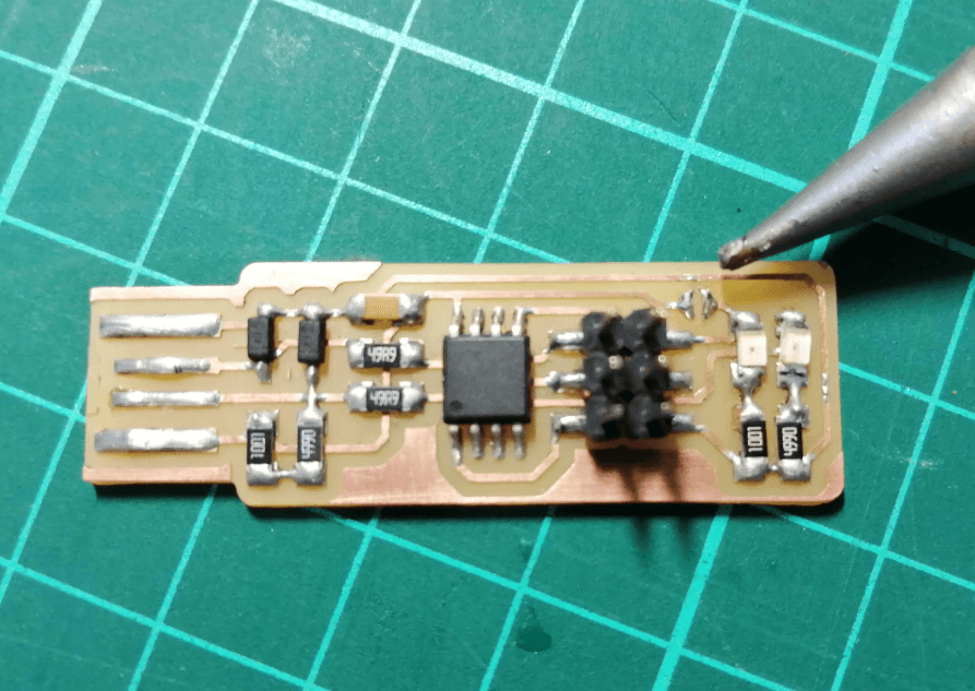 As a conclusion I must indicate that all the tasks were completed with enough time, but I am left with the desire to try to make a flexible circuit board using the vinyl cutter. I consider that the part that demanded the most of this assignment was programming the board, at the beginning I was trying to do everything directly, connected the FabTinyISP directly to the PC and did not see any results, then I realized that it was necessary to use a programmer to program my board, maybe that error was what consumed the most of my time, but then everything went as I expected. I reattach the image of my finished board because I am excited to think that I was able to do this job.