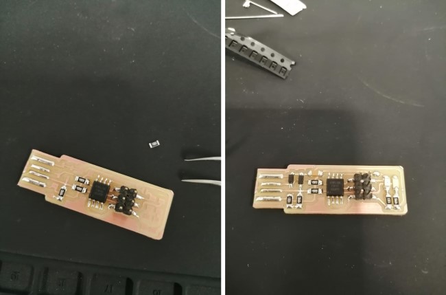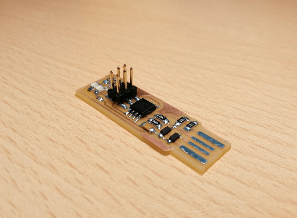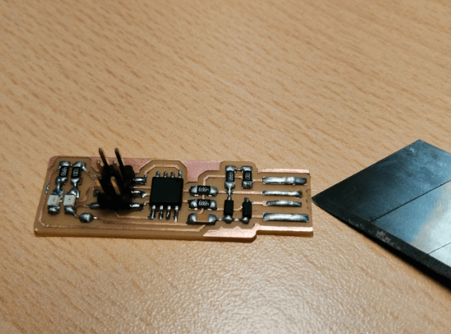 Depending on the number of offsets you milled, there might be a tiny bit of copper left at the edge of the board in front of the USB contacts. 5 offsets should be sufficient to remove all of the copper in the milling process, but takes a bit longer to mill. If you milled fewer offsets (I did 3 in the above photo), the extra copper can be removed with a knife. Only the copper in front of the pads needs to be removed; the copper left on the sides is fine.