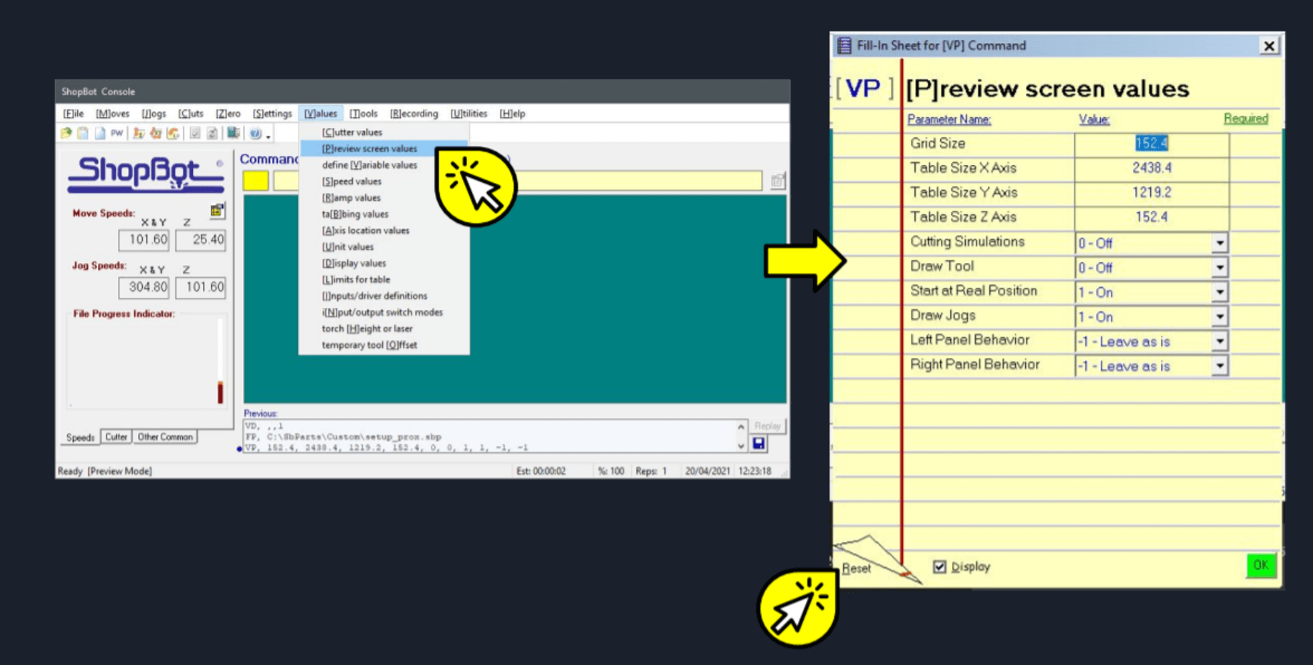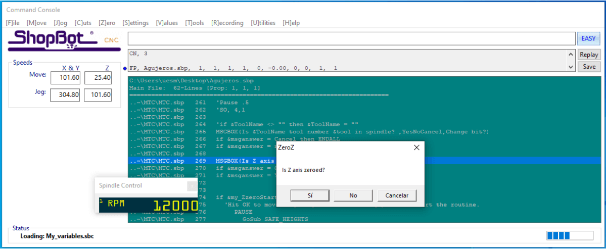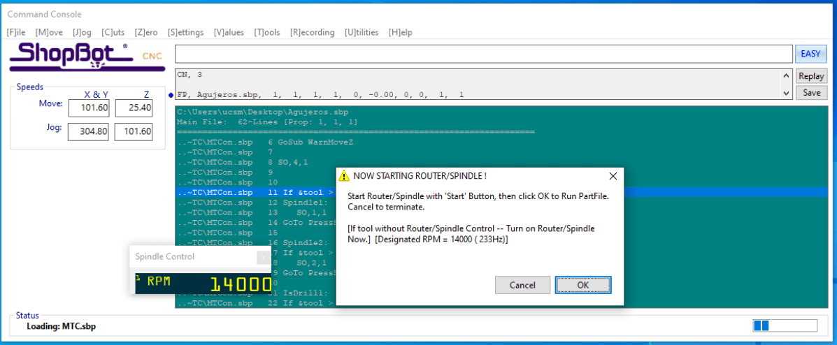 Not everything could be perfect, it had been a long time since the last time we used the shopbot and when we decided to use it in this assignment, we had problems with a VP value Below range that we could not understand at the beginning, then we realized that somehow the values of our The machine had been misconfigured, so it was necessary to restart them, we went to the tab [V]alues then to [P]review screen values and in the lower left part of the window we selected the Reset option. After making this configuration, our machine could work correctly and we continued with the development of our assignment.