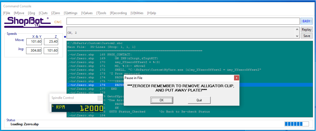 The first thing we must do when opening the shopbot software is to press the reset button, then we must make sure to calibrate our axes, starting with the Z axis, for this we will use the metal plate located on the spindle and the crocodile clips to close a circuit and be able to determine the limit of the Z axis. Then we put everything to its initial position and we can continue calibrating the X and Y axes.