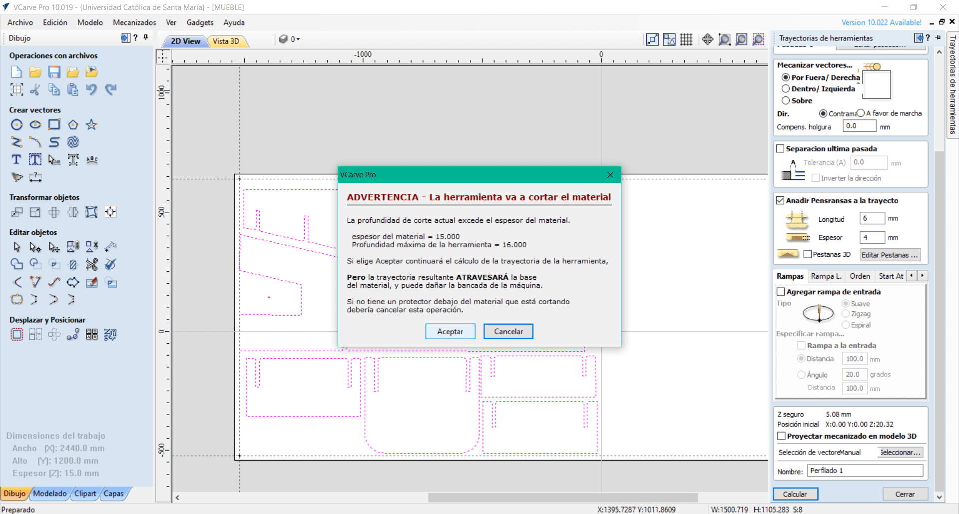 Once all the toolpaths are created, we can calculate all the cuts and see a simulation of the cut, when pressing the calculate button we get a warning that the depth of our cut is bigger than the thickness of the piece, there is no problem since we are aware of that, but it seems to me a very useful warning to be able to give a final review to all the work.