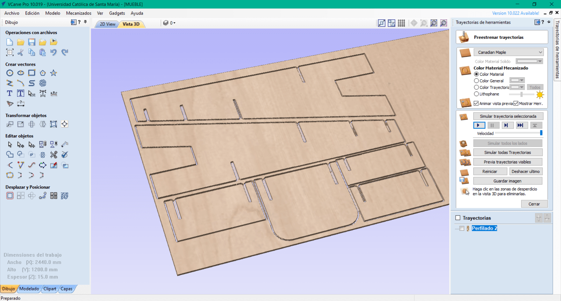 Finally we can run the simulation and check that all our cuts are made as expected, my conclusion is that Vcarve is a very powerful but also user-friendly tool, it was not so difficult to become familiar with the software functions and perhaps I made some errors, but thanks to the feedbacks from my instructor I was able to correct them, we must always keep in mind that when working with large machines it is better to check everything twice to avoid causing accidents.