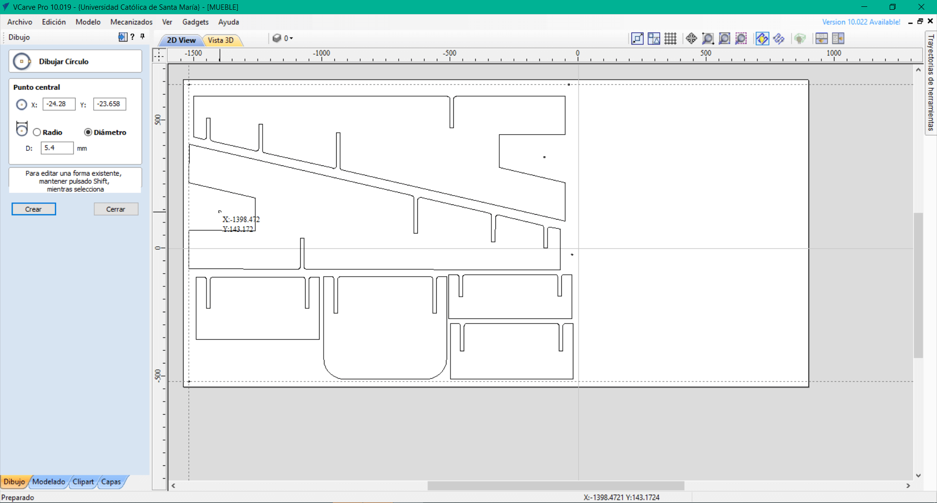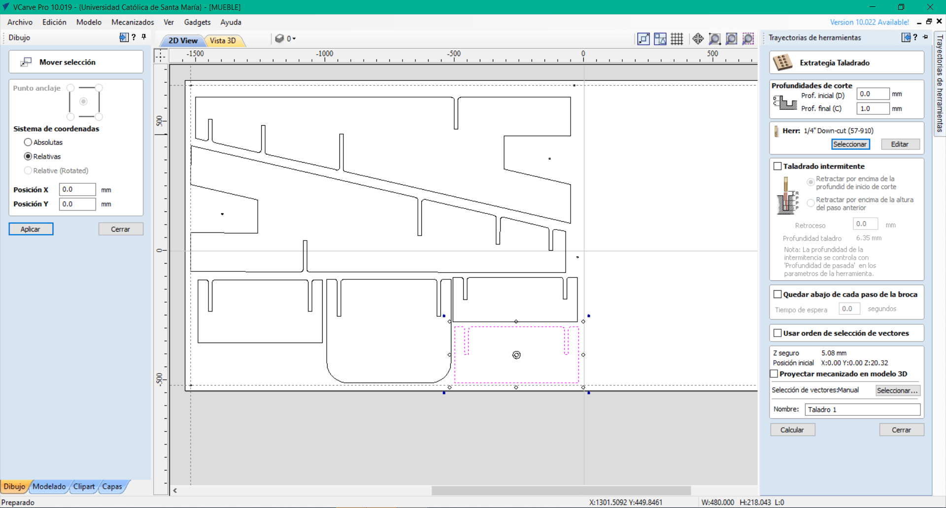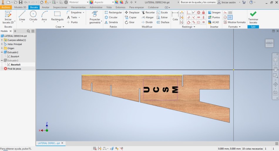 I decided to add letters to the sides of the longest plates with the acronym of the university “UCSM” since Vcarve allows creating a hole or a pocket from the same sketch so I decided to leave them open to both possibilities and later in Vcarve I will finish defining the type of toolpath that I will assign to those letters.