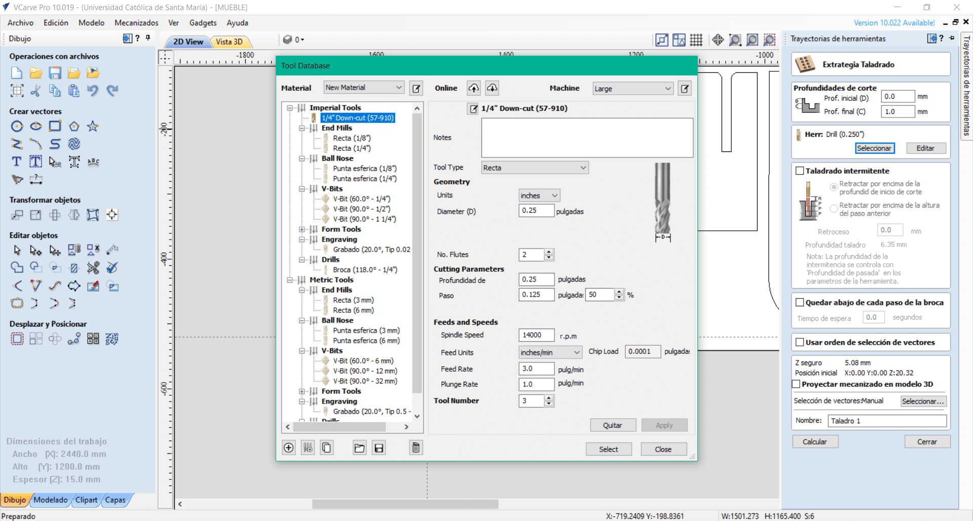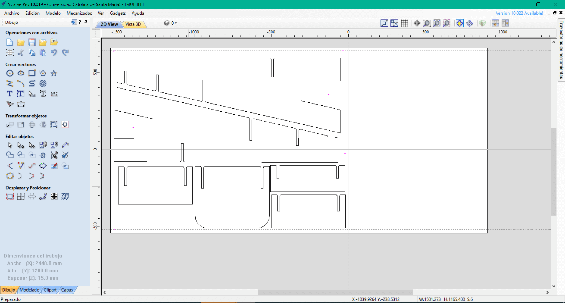 With all our DXF files already generated we can load them to Vcarve, first we must define some important parameters that are Job size (workspace of 2440 x 1200mm), Material thickness and XY Datum position, we must also remember to select the units of measurement in this case millimeters mm.
