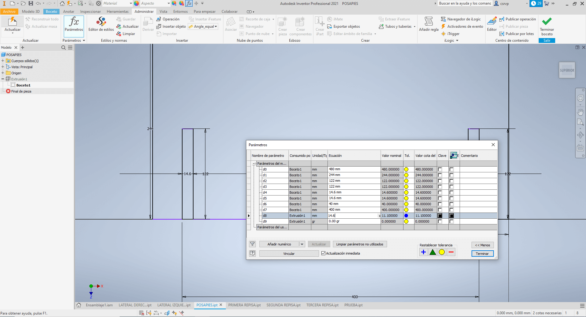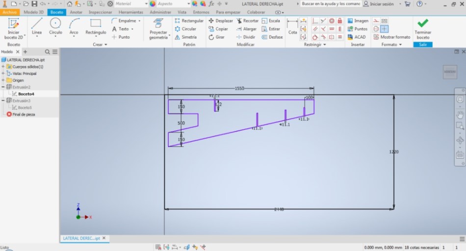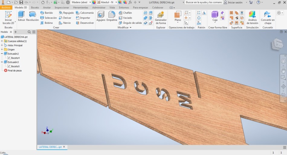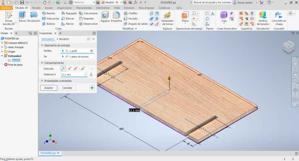 Since we previously learned the advantages of a parametric design, I decided to apply it to this assignment to make changes easier, for example vary the thickness of the material according to the availability of our local distributor, as you can see in the images the initial thickness considered was 11mm and thanks to the parametric design the thickness change was made to 14.6mm due to the actual thickness of our OSB part.