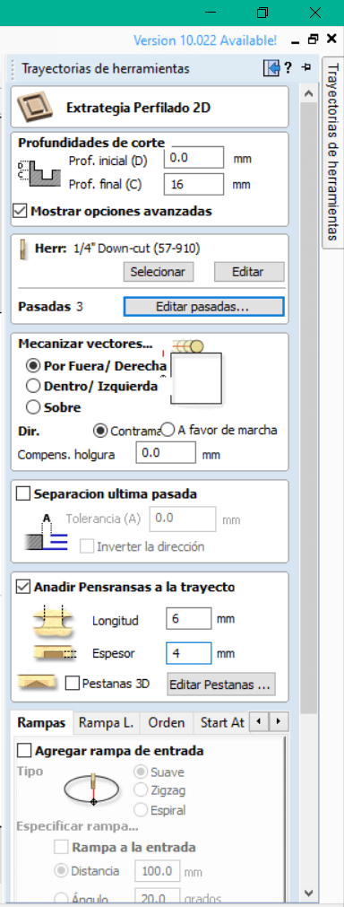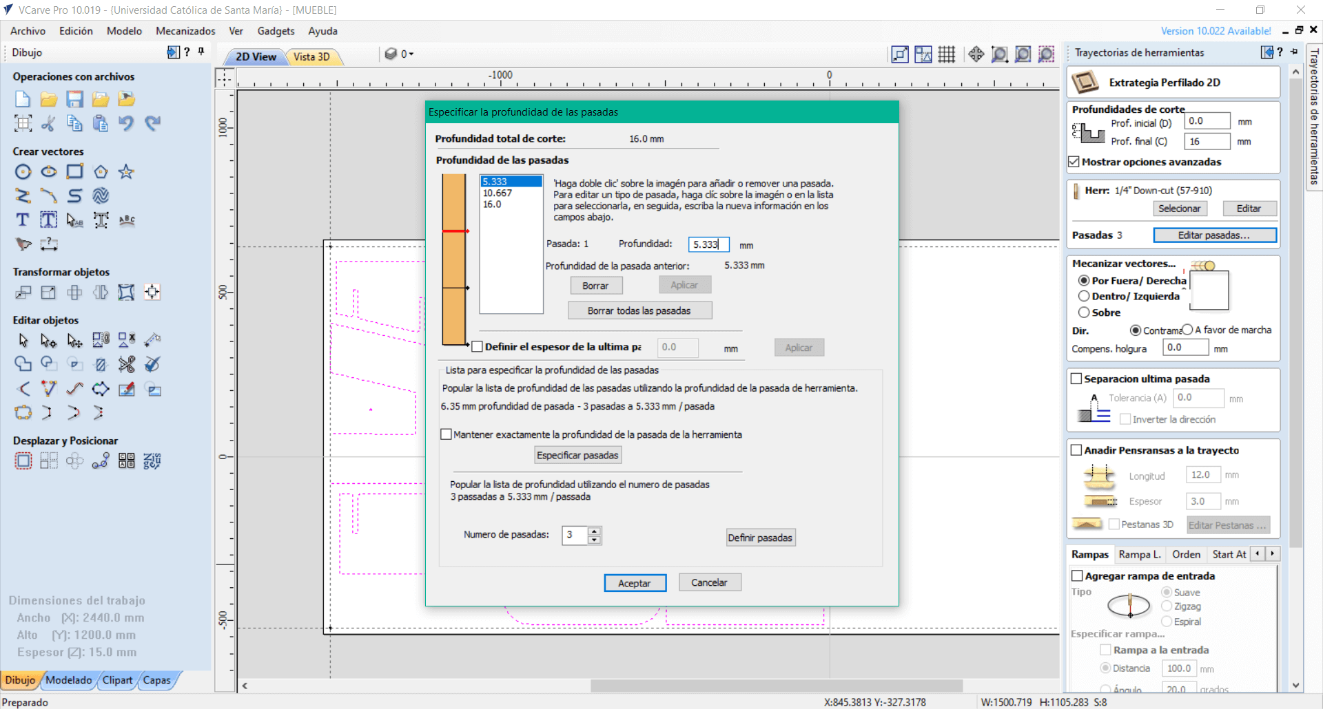 It only remains to define the depth of the passes, our plate is 15mm thick, to make a uniform cut we assign a value of 16mm and according to the software it is recommended to make 3 passes of 5.333mm each, a tip is that the maximum pass depth should not be higher than the diameter of the endmill, ours is 6.35mm, so 5.333mm is in the range of what is allowed.