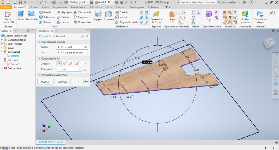With the sketch in 2D we already have everything we need to export the DXF files to Vcarve, but I decided to make extrusions and turn them to a 3D shape to appreciate the final result, I also gave the material wood texture so it will look as close as possible to reality.