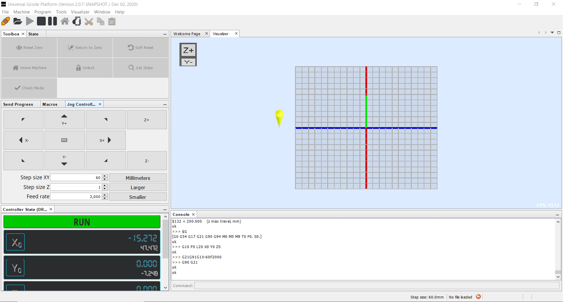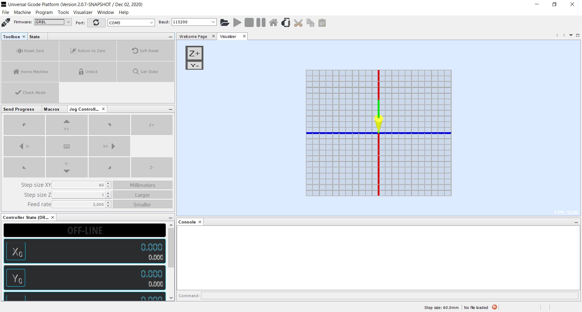Once connected, the symbol will turn orange and values will appear in the console window, that will confirm that we managed to connect correctly, as you can also see, all the buttons now allow to be pressed except for the Home button, this is because we are not using end stops for the axes.