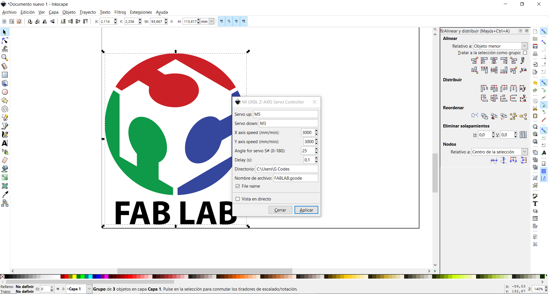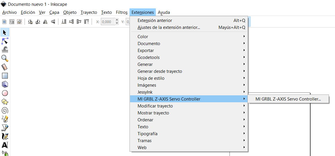 We can generate our own g-code files, for that I will use an Inkscape extension that allows me to transform images into trajectories, the name of the extension is MI GRBL Axis Servo Controller and it is not complicated to add or use, also it is very similar to this extension Inkscape Laser plugin recommended for CNC plotting, but I wasn’t able to fully understand how it works, but their tutorials were very useful to allow me to generate the files.
