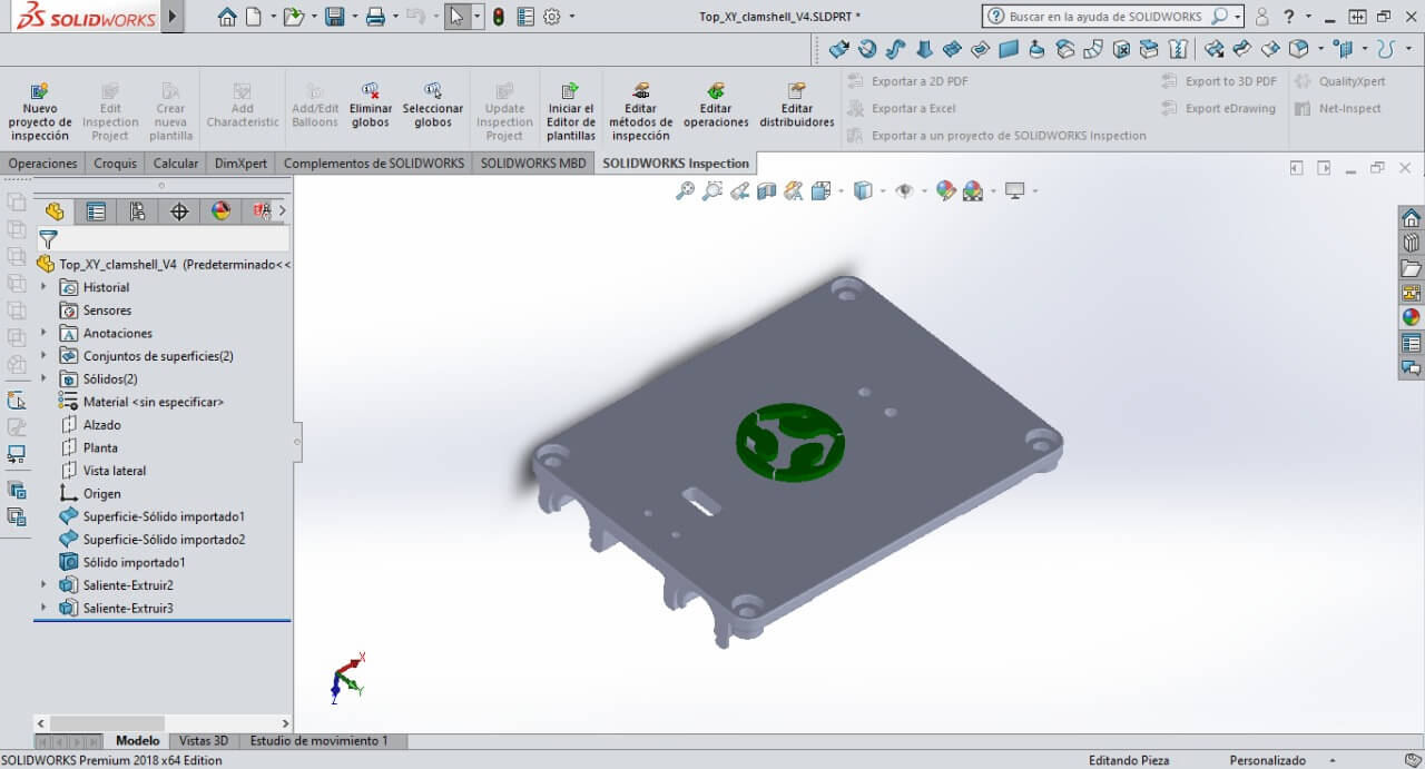 Finally, the middle piece that will connect both axes will be elaborated, it has 4 bearings to guide the belts and 4 linear bearings to guide the rods to avoid friction, I decided to add the fablab logo to give it a personalized touch and that was all to do (That was what I thought, but I was wrong).