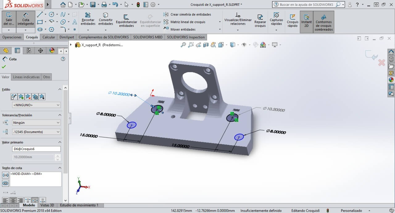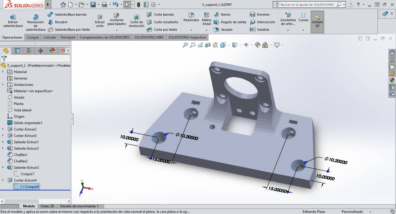 With all of that defined I can start to make the parts in Solidworks, I will start designing the X axis parts, which will be in charge of holding both Nema motors, as shown in the diagram I will use 4 smooth rods to add weight to the axis, I consider it to be something important to prevent the entire chassis from shaking when performing the movements, obviously that can also be solved by reducing the speed and acceleration of the movements, as you can see in the image, I don’t directly enter the value of 10mm for the holes in the shafts, since my printer’s tested resolution showed it to have 0.2mm offset, so I will assign 10.2mm for all rod holes.