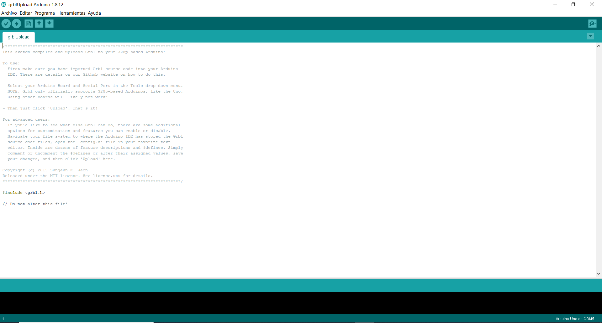 We search in File -> Examples -> GRBL -> grblUpload, we open and compile it to check that there is no problem with the modification we make, then we can upload the file to our Arduino UNO, it is important that to upload the file we remove the CNC shield from the Arduino to avoid communication problems, once all this is done, it would be ready to receive the commands to move the axes.