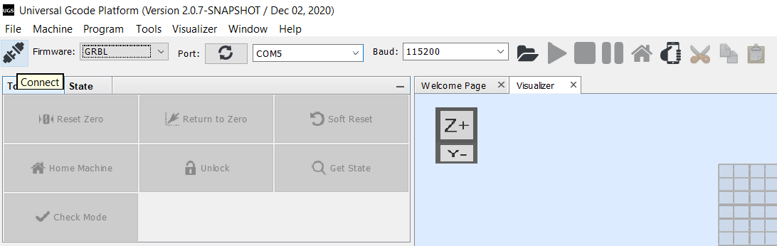 Now we need to download Universal G-code sender, it will be the interface that will allow us to control our CNC plotter through commands or by entering g-code files. The first step is to link our Arduino with the UGS interface, we have to connect the Arduino to the USB port through the cable, then we open UGS and a button called Connect will appear in the upper left corner, before clicking we must check the following information: