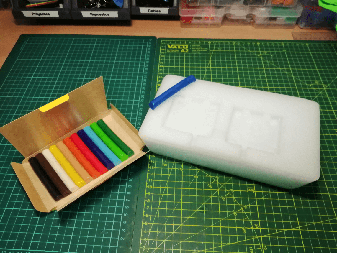 For this second attempt, I did a search for compounds available in the local market and I was able to get RTV silicone rubber, they told me that it was the correct one to make molds so I bought it. This mixture worked in a different way since it used a catalyst that had to be measured by a specific number of drops, performed the necessary math operations and defined the amount of mixture, elaborated the mixture and poured it into the wax matrix to make the mold, as you can see this mold was much better that the first and the details managed to stay mostly.