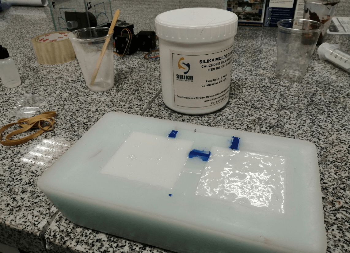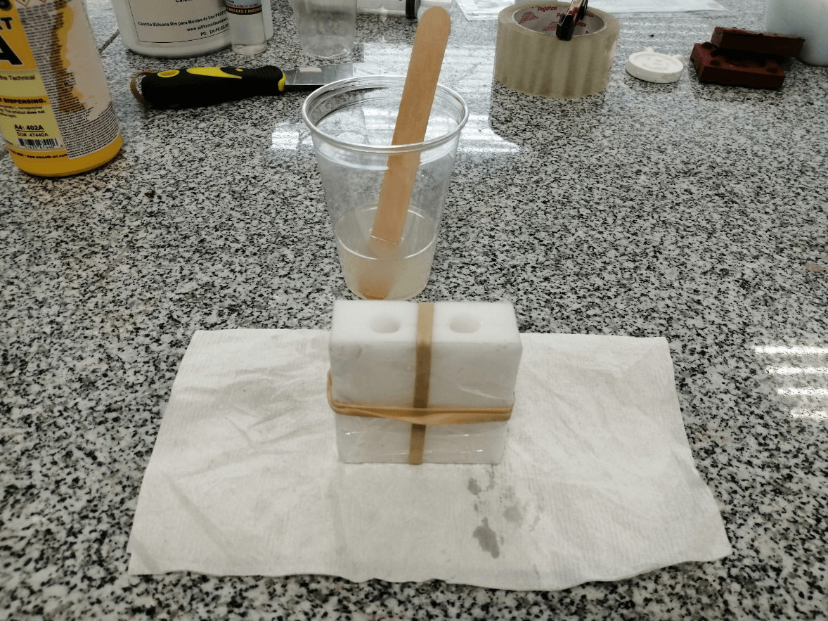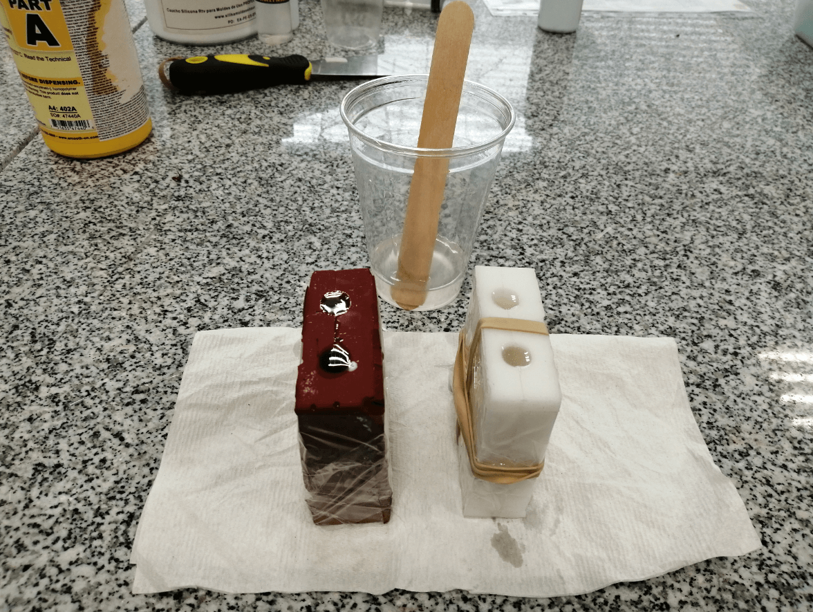 Unfortunately most of the compounds were in poor condition, in a desperate attempt to test the Oomoo I decided to mix it with my own hands (using gloves) and I managed to get a viscous mixture that I could apply in my mold, the same happened with the Mold-max It was expired and it was not possible to apply it to test, last but not least the resin worked correctly as you can be see in the glass located on the left, it cured in less than 30 minutes and we were thus able to test what materials we can use. I’m sorry for the mess in the photo, since most of the compounds were out of date I managed to run a quick test.