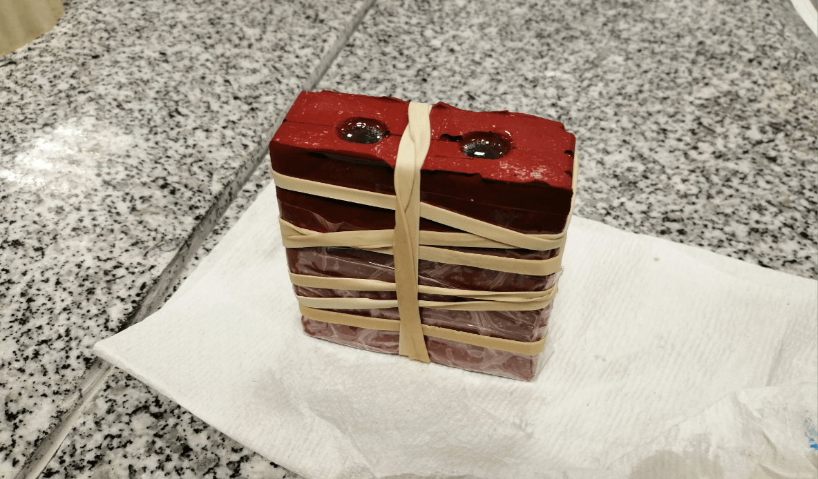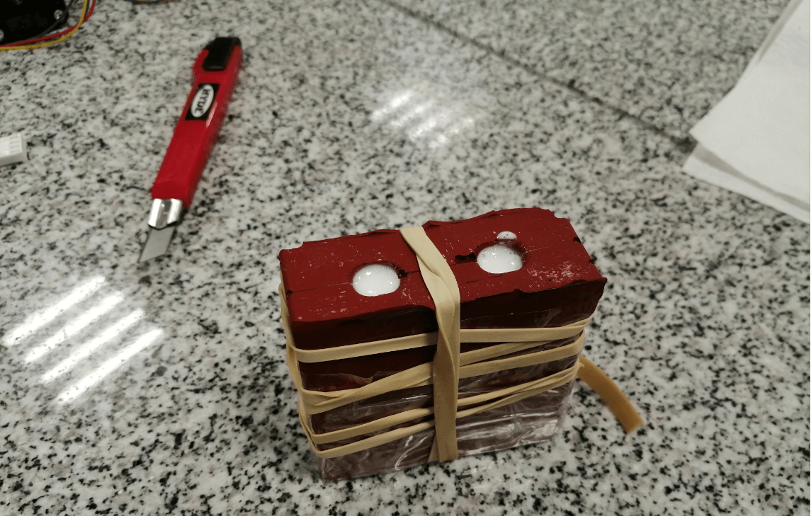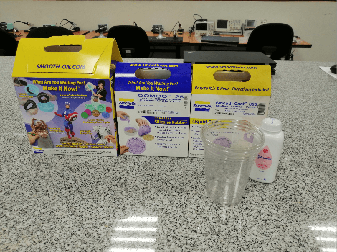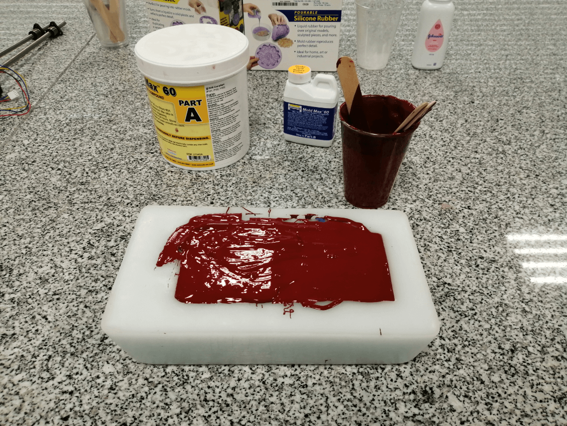 Unfortunately most of the compounds were in poor condition, in a desperate attempt to test the Oomoo I decided to mix it with my own hands (using gloves) and I managed to get a viscous mixture that I could apply in my mold, the same happened with the Mold-max It was expired and it was not possible to apply it to test, last but not least the resin worked correctly as you can be see in the glass located on the left, it cured in less than 30 minutes and we were thus able to test what materials we can use. I’m sorry for the mess in the photo, since most of the compounds were out of date I managed to run a quick test.