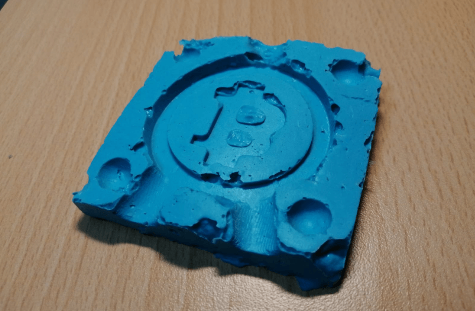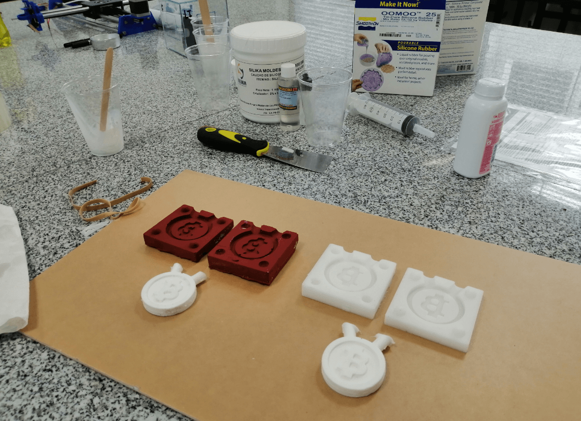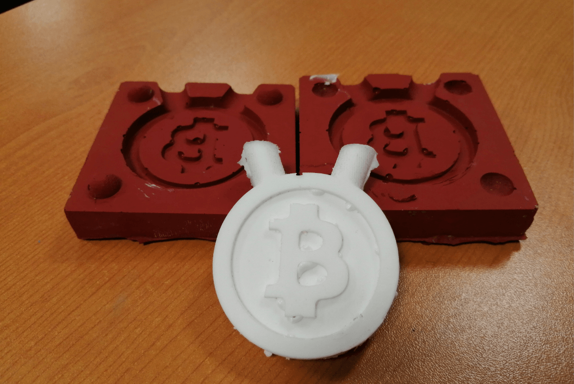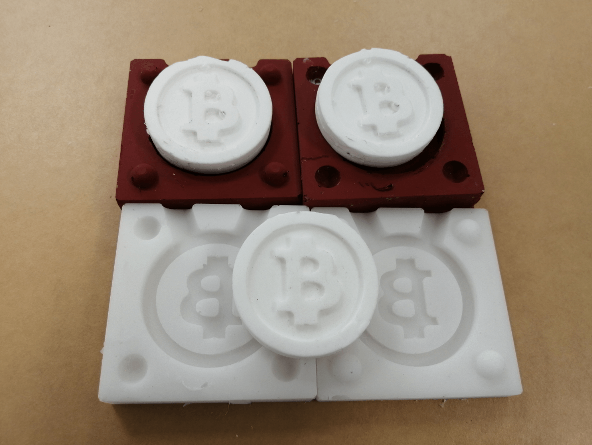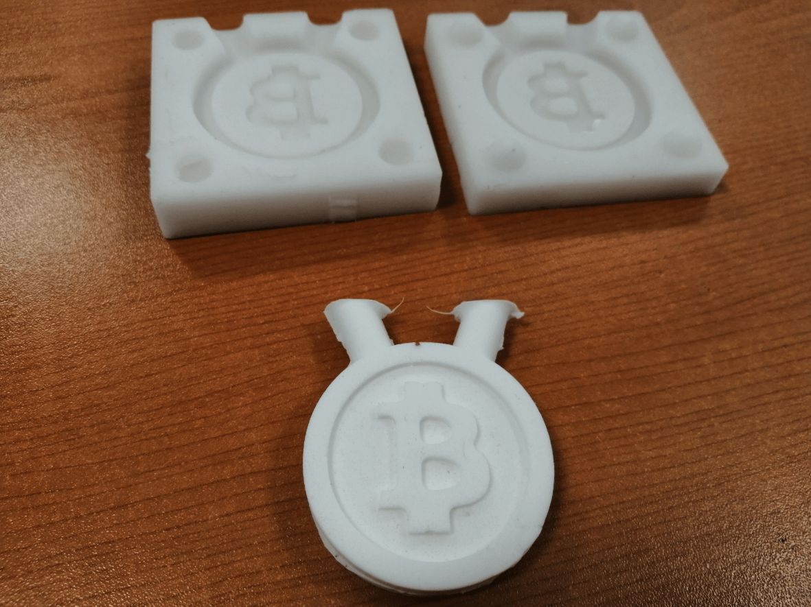 In order not to complicate myself, I decided to make a coin, being more specific a Bitcoin token, initially I planned to model something more complex, due to the good resolution of our milling machine (Monofab SRM-20), but I decided to do something simple due to the short time with we have to perform tests and allow the material to cure correctly, because of that I will be able to test different materials in our mold.