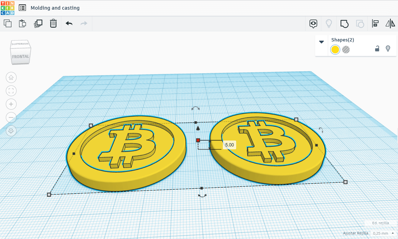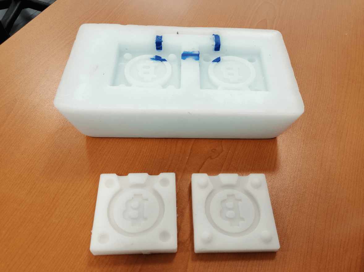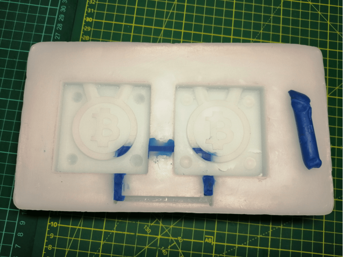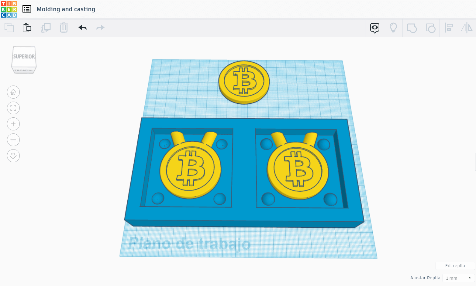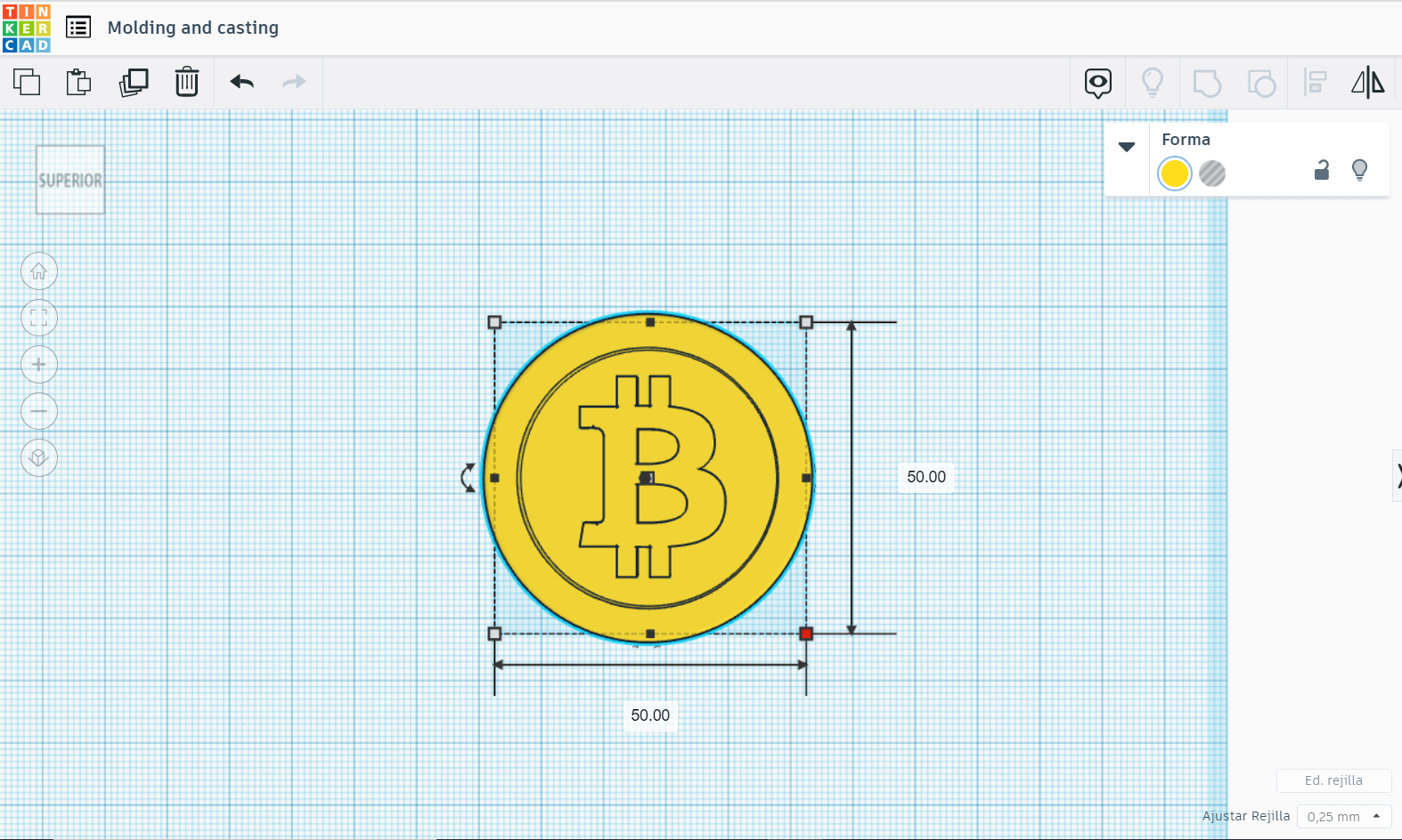 In order not to complicate myself, I decided to make a coin, being more specific a Bitcoin token, initially I planned to model something more complex, due to the good resolution of our milling machine (Monofab SRM-20), but I decided to do something simple due to the short time with we have to perform tests and allow the material to cure correctly, because of that I will be able to test different materials in our mold.