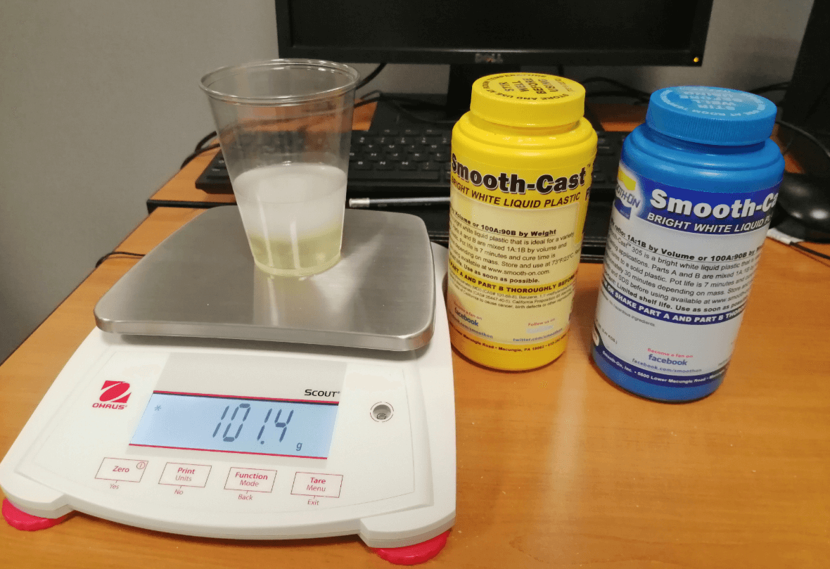 Due to the fact that all the compounds were expired, I decided to use Mold-Max 60 for the moment (Expiration date December 2019), at the time of mixing I could verify that the viscosity was not the same and that there would be problems with bubbles, I mixed part A with 3% part B using the scale to define the exact quantity. I continued with the procces and test the final result, I was right and in the end the mold ended up with bubbles in some details.