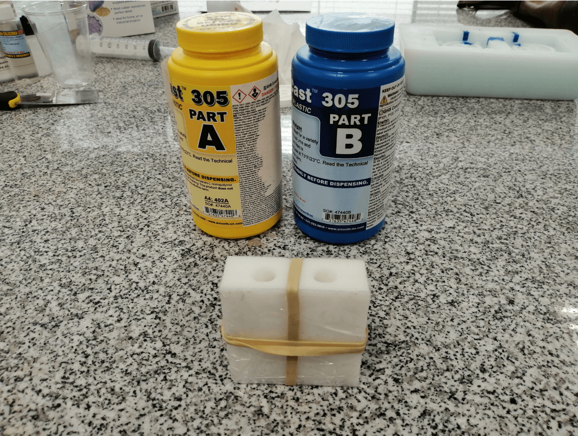 For the casting process I decided to use resin since according to the previous tests it seemed to work correctly, so I made the mixture of 2 equal parts with the help of the scale and secure my mold using tape to prevent leakage and rubber bands to keep the mold tightly pressed. The resin cured in 30 minutes as indicated by the manufacturer (change from clear to white color) and I decided to leave it for 1 hour more to be sure that everything would go well, finally, separate the mold and the final result came out much better than what I expected.