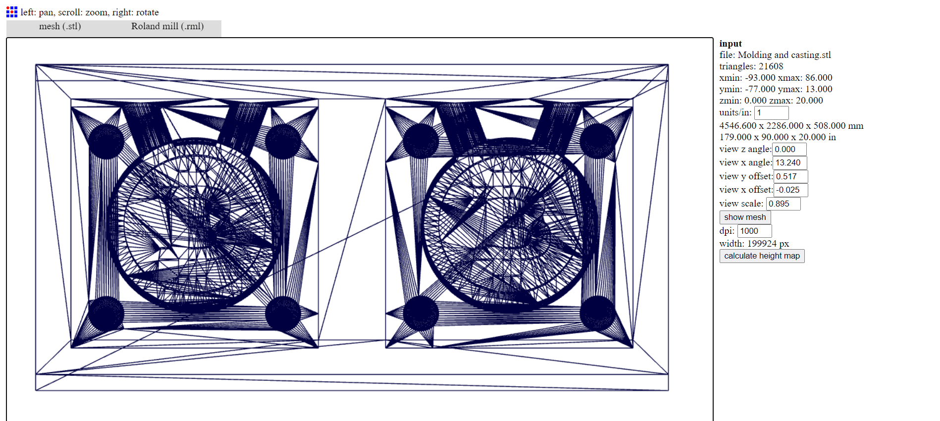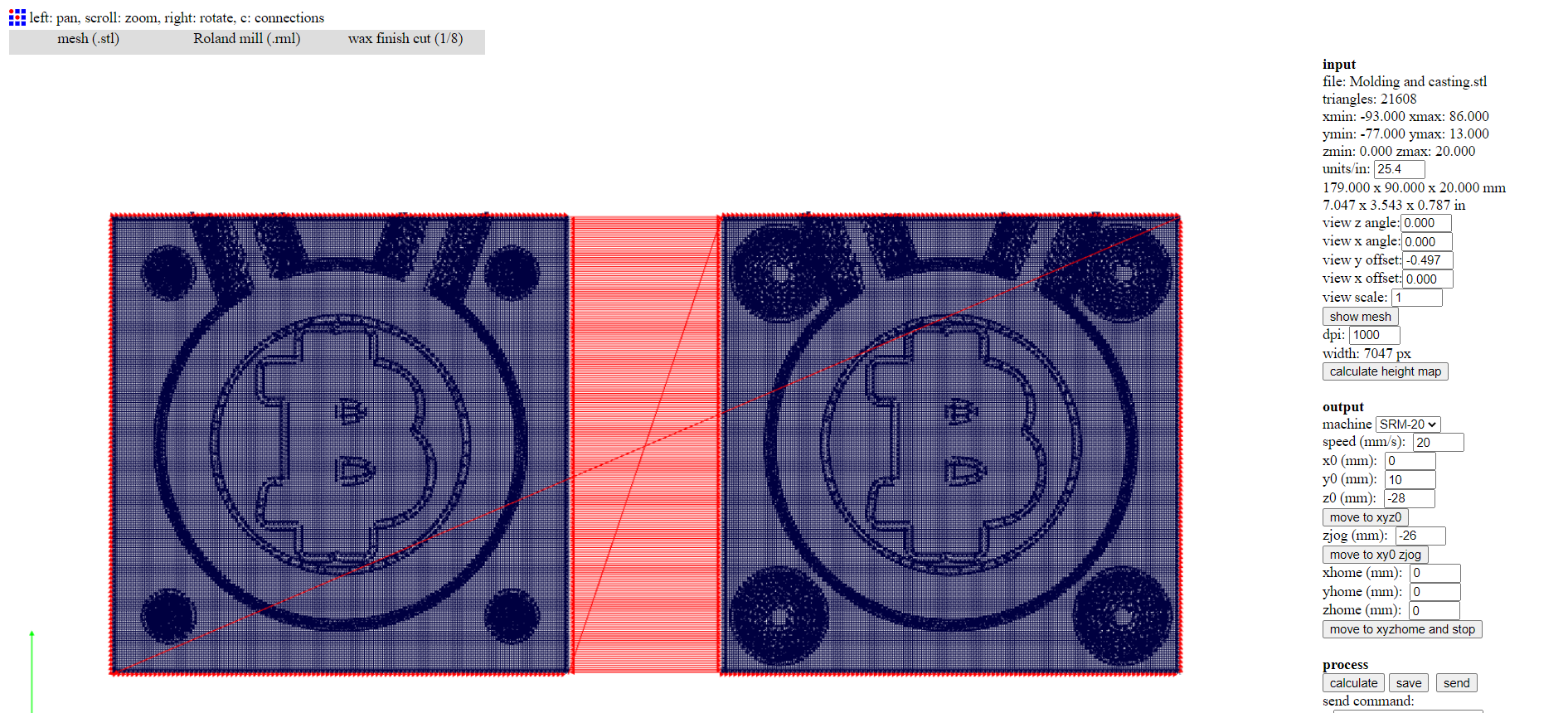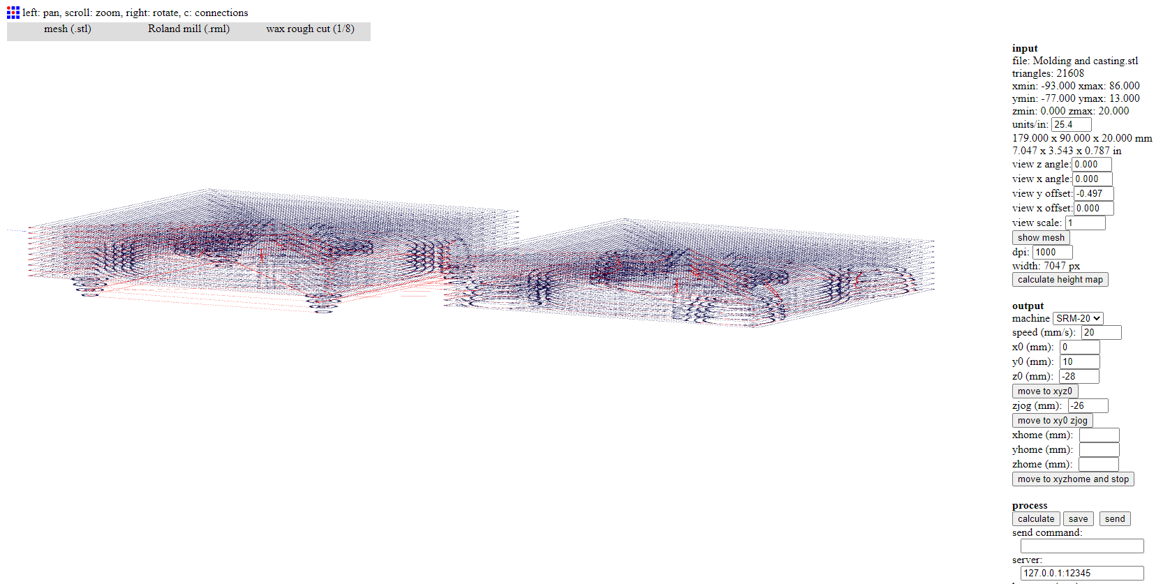 Finally, with the mold already finished, we can export it in .stl format and load it into Fabmodules, we must select the appropriate parameters for both the rough cut and the finish cut, taking into consideration the diameter of our endmills for each type of work, generated both toolpaths it is only necessary to load it to the monofab, prepare the material and start with the milling process.