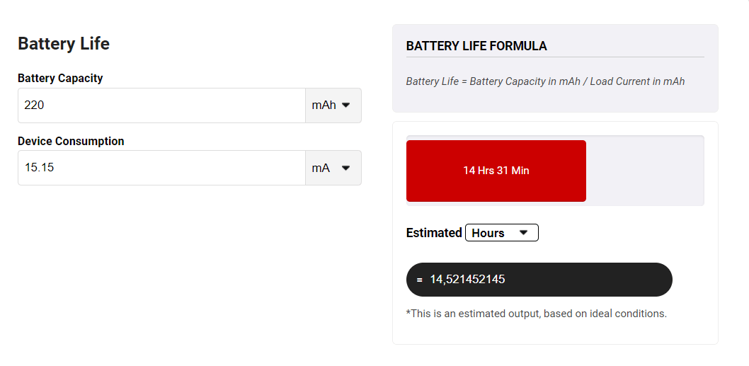 I will use the last value obtained as the average load current, to obtain an estimated value of the battery life, assuming that its current is 220mAh. The operation is a simple division, but we can also do it on the same Digikey page Battery life calculator