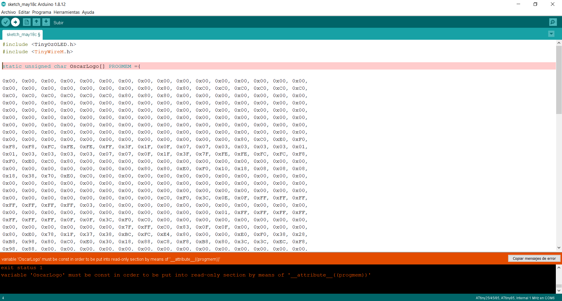 The first problems began to appear at the time of compiling the program, because as shown in the image the OscarLogo variable is defined as static unsigned and should be const unsigned, I did the modification as indicated by the Arduino IDE and proceed to upload the program to our board.