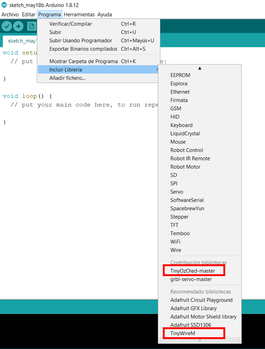 As I explained previously, the plan is to control the OLED screen SSD1306 128x32 with my board, several steps will be necessary to achieve that goal, first we must include the libraries that will be necessary to make the OLED screen work OzOled and the library that allows communication I2C on the ATtiny85 TinyWireM . Both will be installed in the Arduino IDE to allow us to elaborate the code and compile it without any problem.