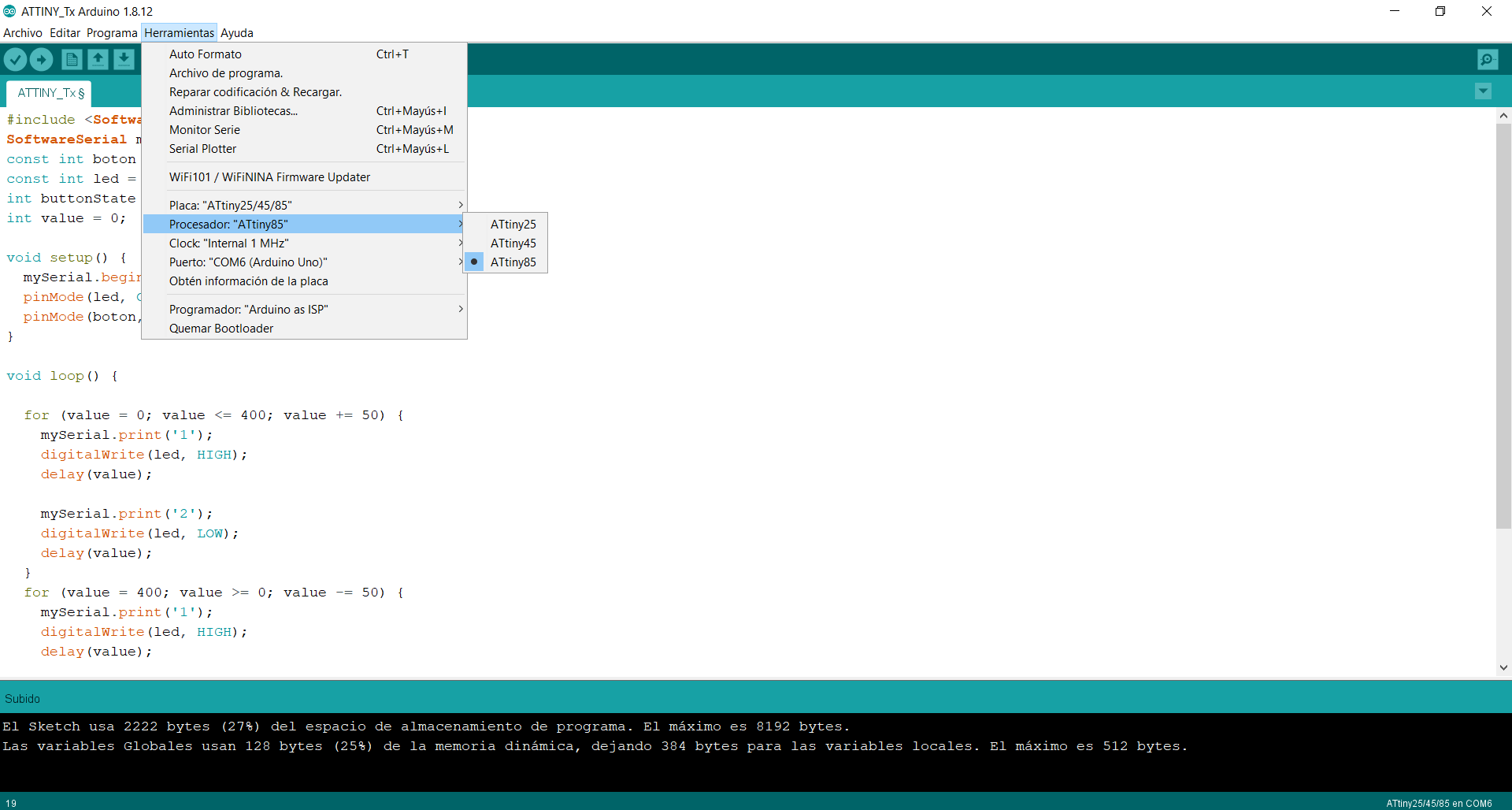 To load the code onto the board, I used an Arduino UNO as ISP programmer, selecting ATtiny85 as the microcontroller for the master board.