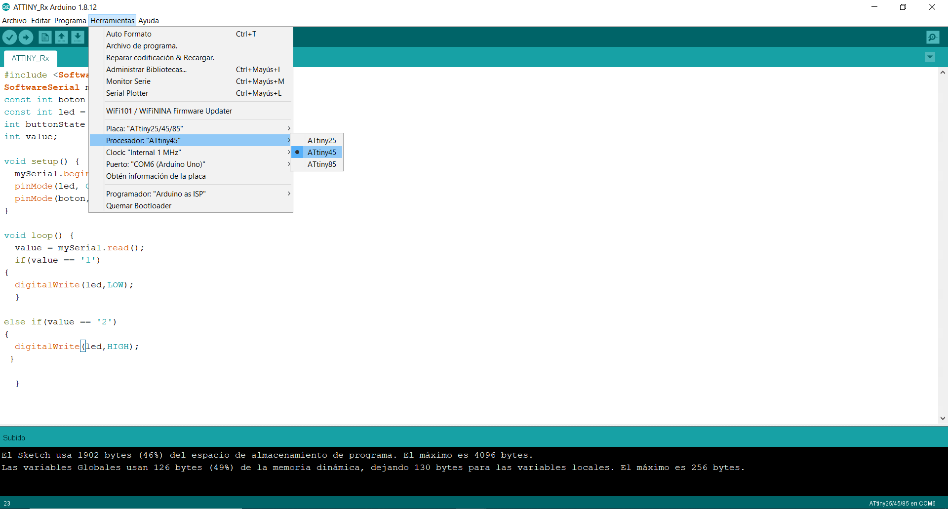 To load the code onto the board, I used an Arduino UNO as ISP programmer, selecting ATtiny45 as the microcontroller for the secondary board.