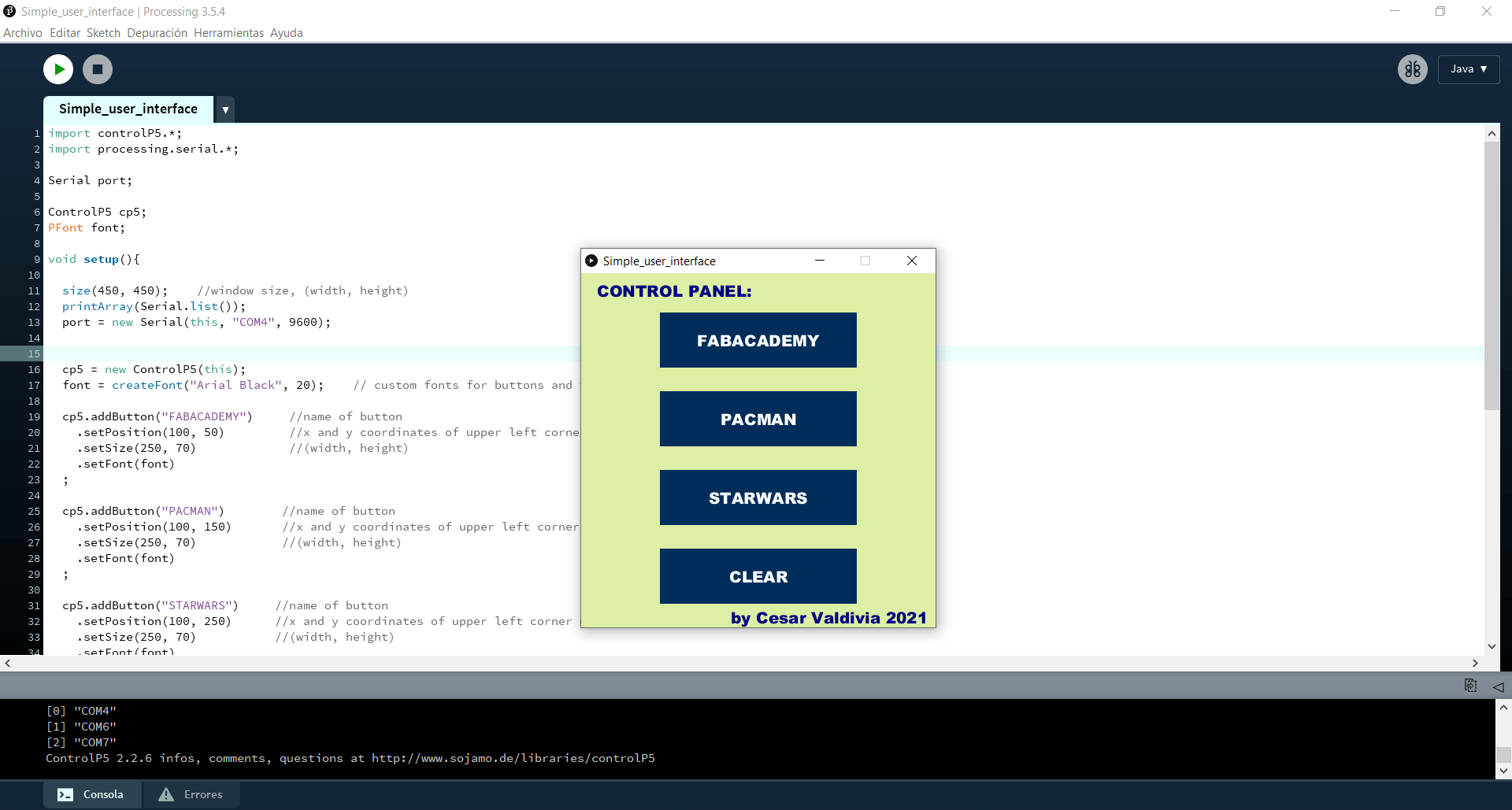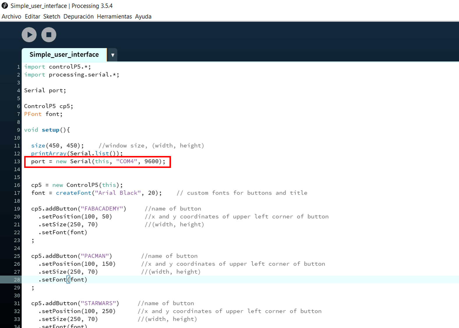 After importing the library we can start to develop the code for the graphical user interface GUI, since we will keep the same code on our board, this code focuses more on assigning sizes, colors, text and sending the characters that we assign when pressing a button, I used Control Arduino using GUI Processing as a starting point to build my code and it was very helpful, plus most of the instructions were explained.