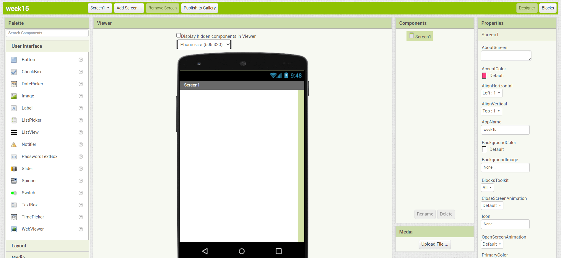 The interface is well marked and as we can see on the left side we have a palette to select everything necessary to develop our application, on the right side we have a window that is updated with all the components that we are adding and also another window that is enabled when we select some component.