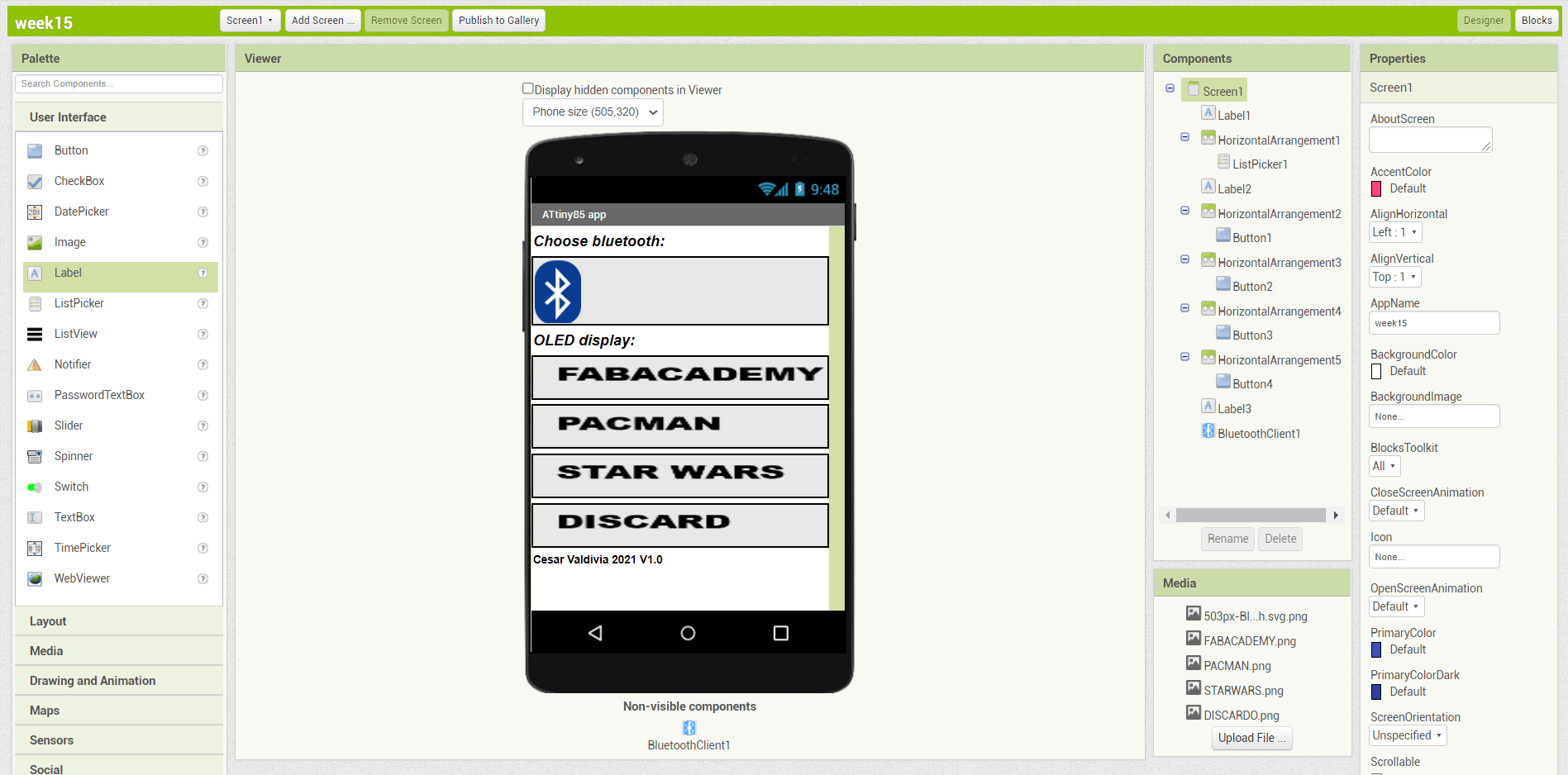 I decided to use a basic code in charge of interpreting the characters sent by the mobile application and showing a default image, since this little ATtiny does not have Tx and Rx pins, it is necessary to use the SoftwareSerial library to assign 2 pins that will fulfill the function of Tx = 1 and Rx = 4. Also following the steps of the Output devices assignment, I am going to generate 3 bmp files with the Fabacademy, Pacman and Star Wars images.