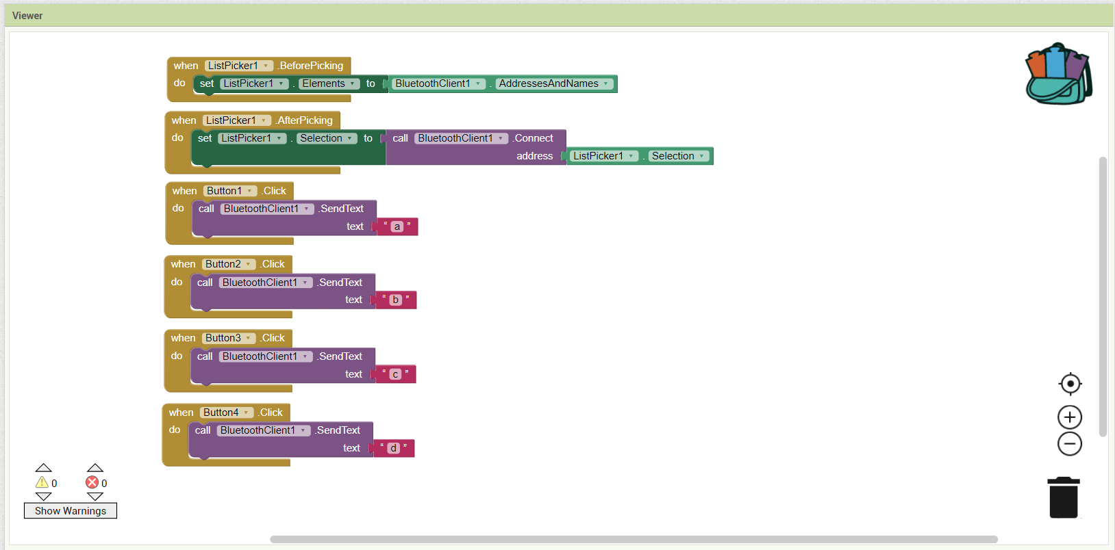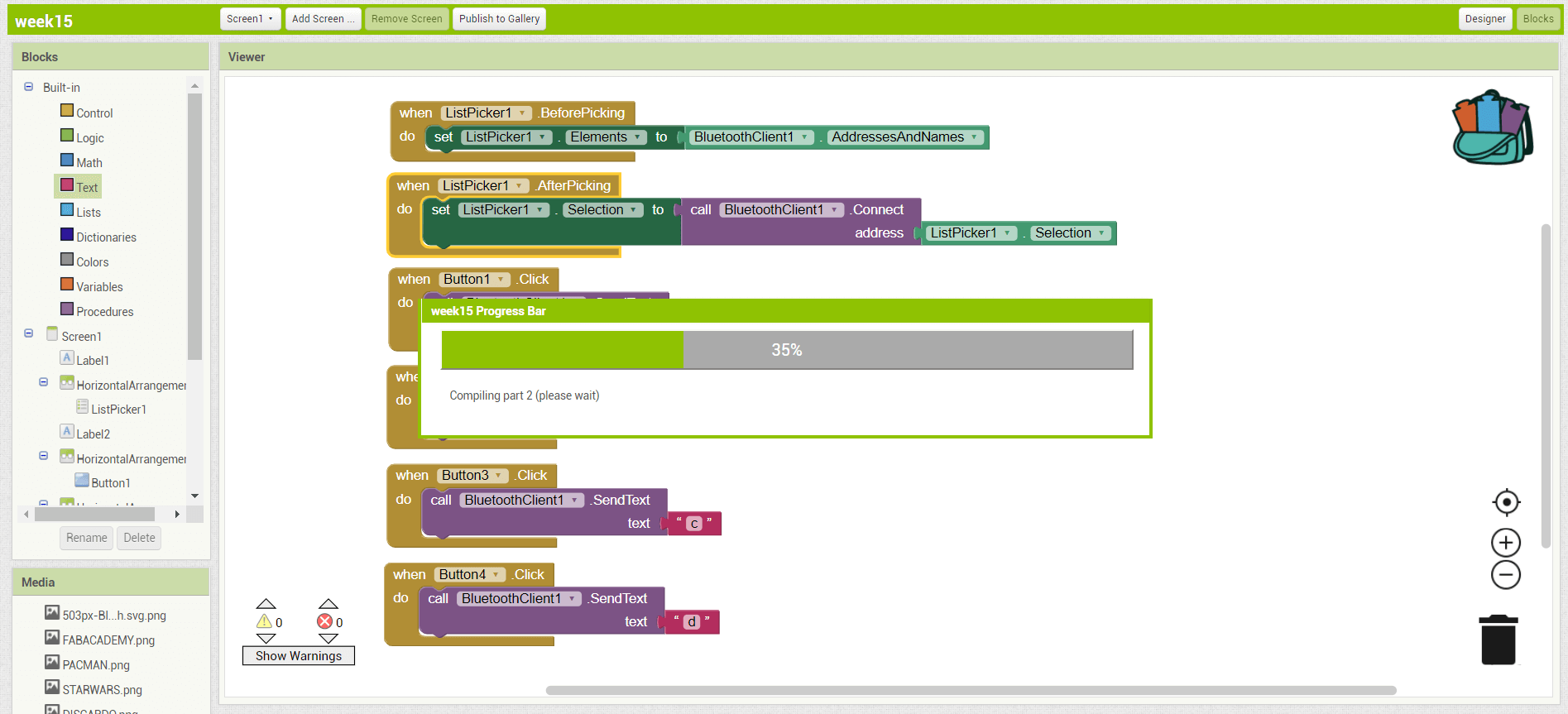 Continuing with the process of developing the app, now we must click on the upper left tab Blocks and assign blocks to all the buttons that we defined previously, for example establish actions both for the start of the bluetooth link and for the end (BeforePicking and AfterPicking).