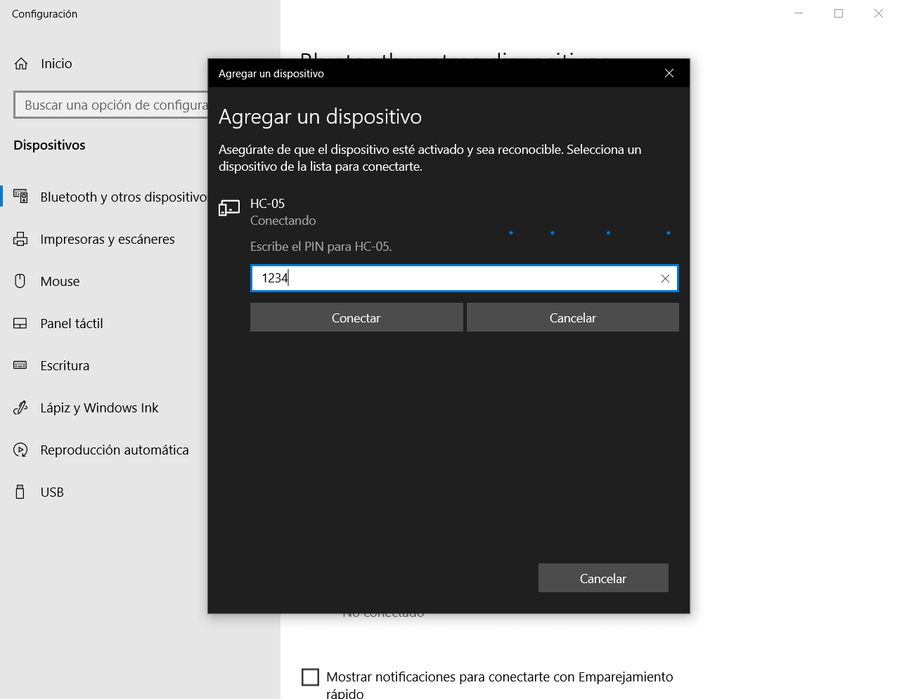 As extra work (because I don’t have a group to compare the tools they used), I decided to develop an application in Processing to control my board based on the button I pressed on the graphical interface of the PC, but in order to perform the tests I must enable bluetooth communication between the PC and the board, I must also identify the port COM assigned to bluetooth communication to later add it in the code.