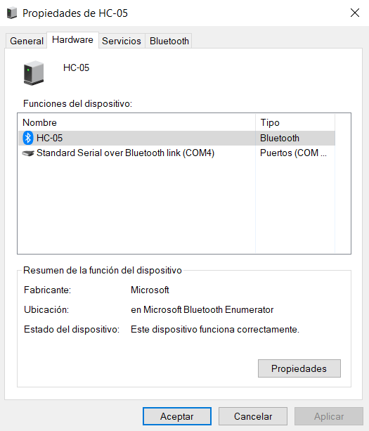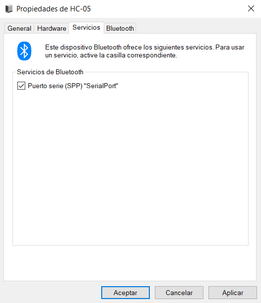 We can easily identify this by checking the properties of the bluetooth device after having paired it with the PC, if it does not appear then we must enable the SPP serial port and it will automatically assign a COM port to our device.