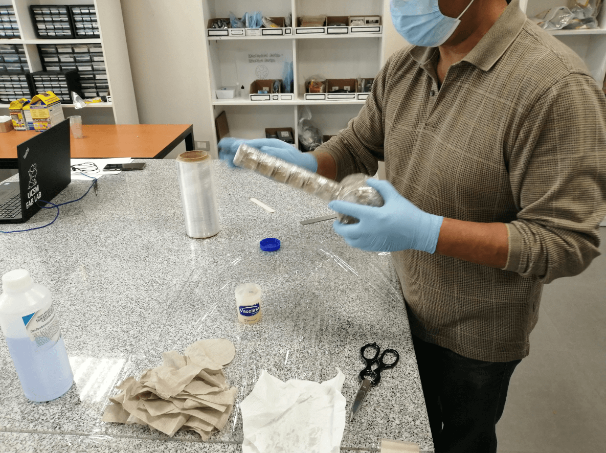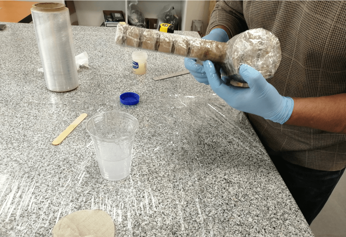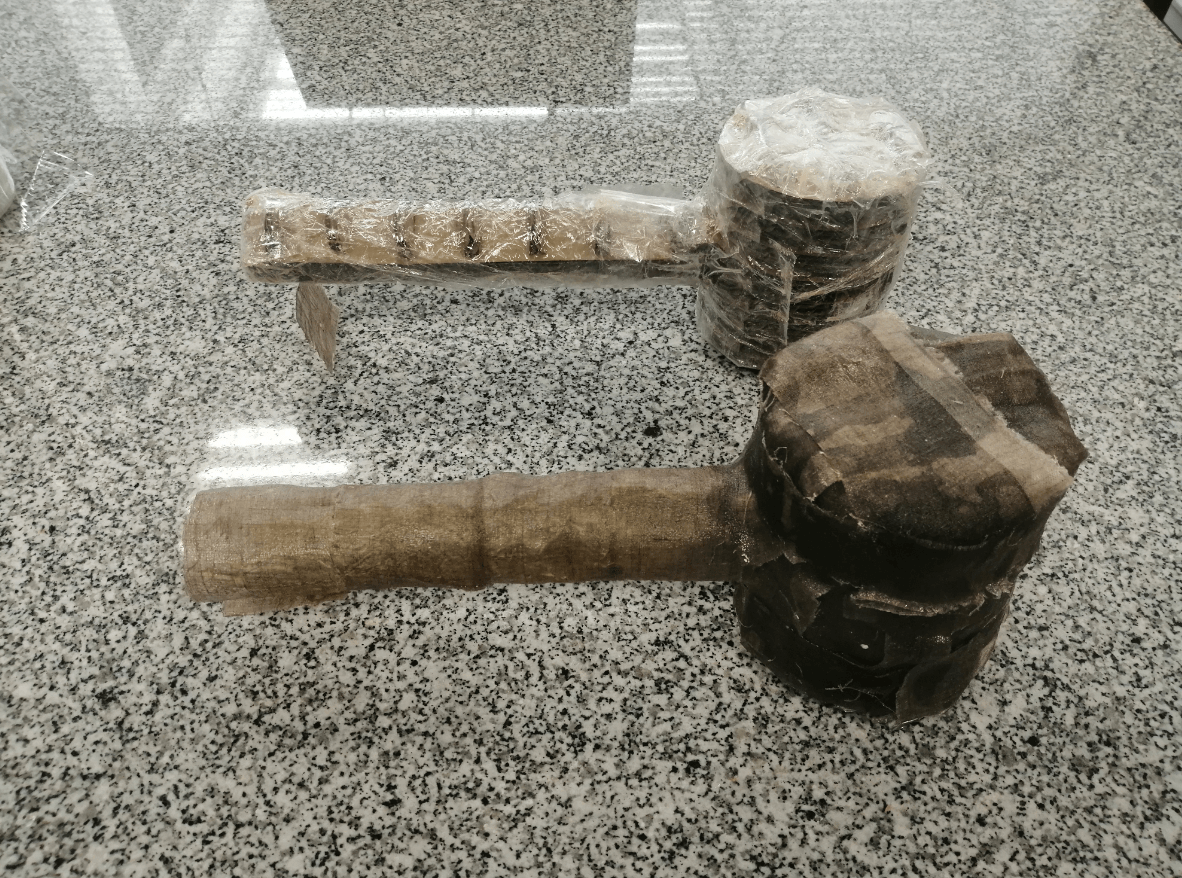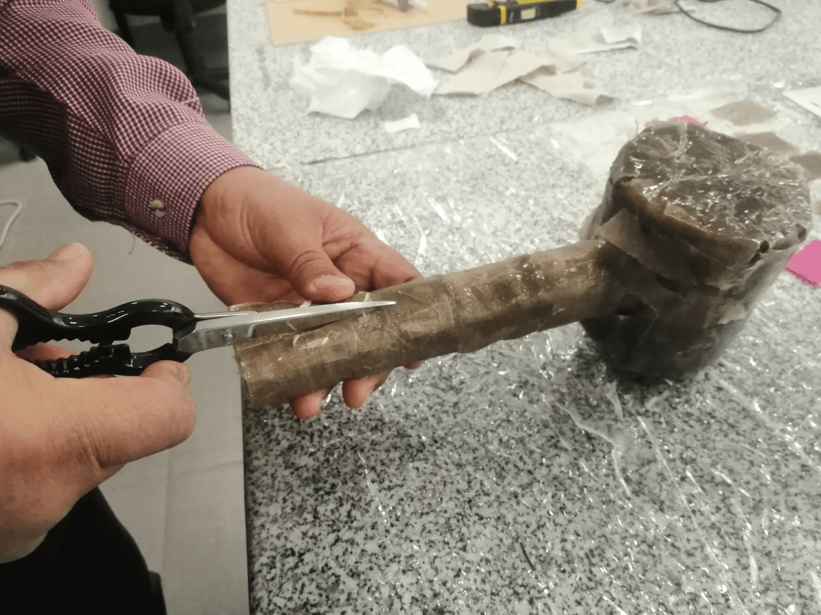 Since we decided to make a mold of our hammer in cardboard and because our piece has exposed parts, we must protect it with a film, we also use tape to improve the coverage in some parts of difficult access and finally we cover the entire piece with an uniform layer of vaseline so that later we can more easily separate our cured resin from the mold.