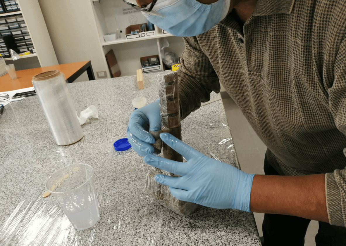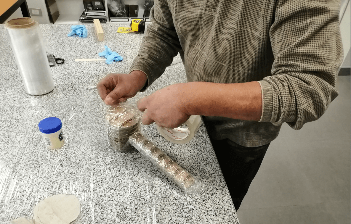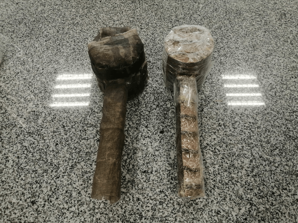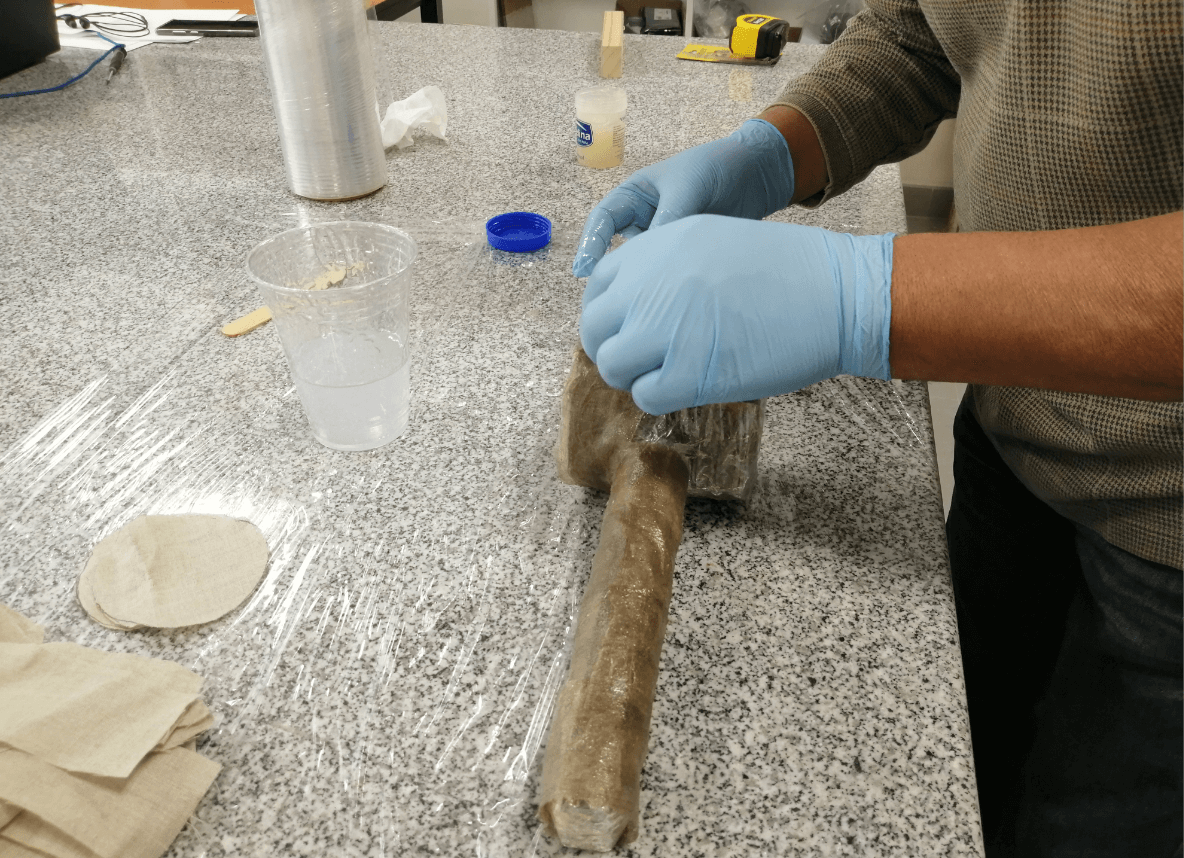 Since we decided to make a mold of our hammer in cardboard and because our piece has exposed parts, we must protect it with a film, we also use tape to improve the coverage in some parts of difficult access and finally we cover the entire piece with an uniform layer of vaseline so that later we can more easily separate our cured resin from the mold.