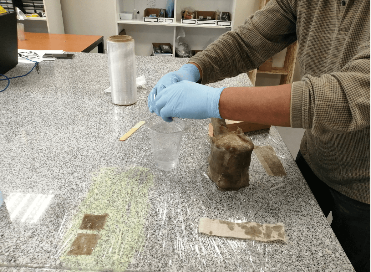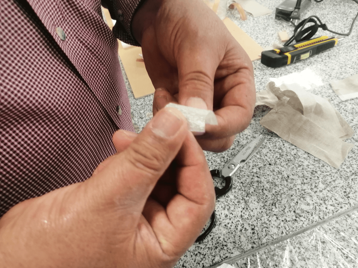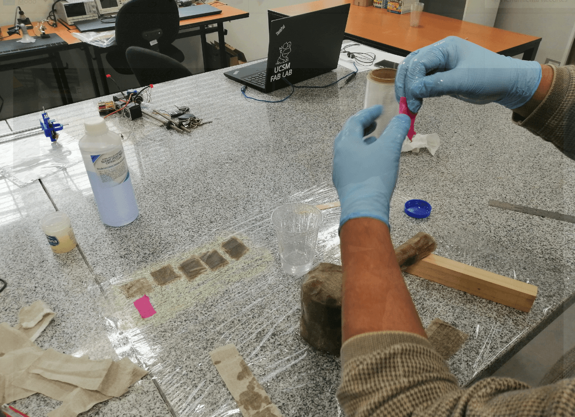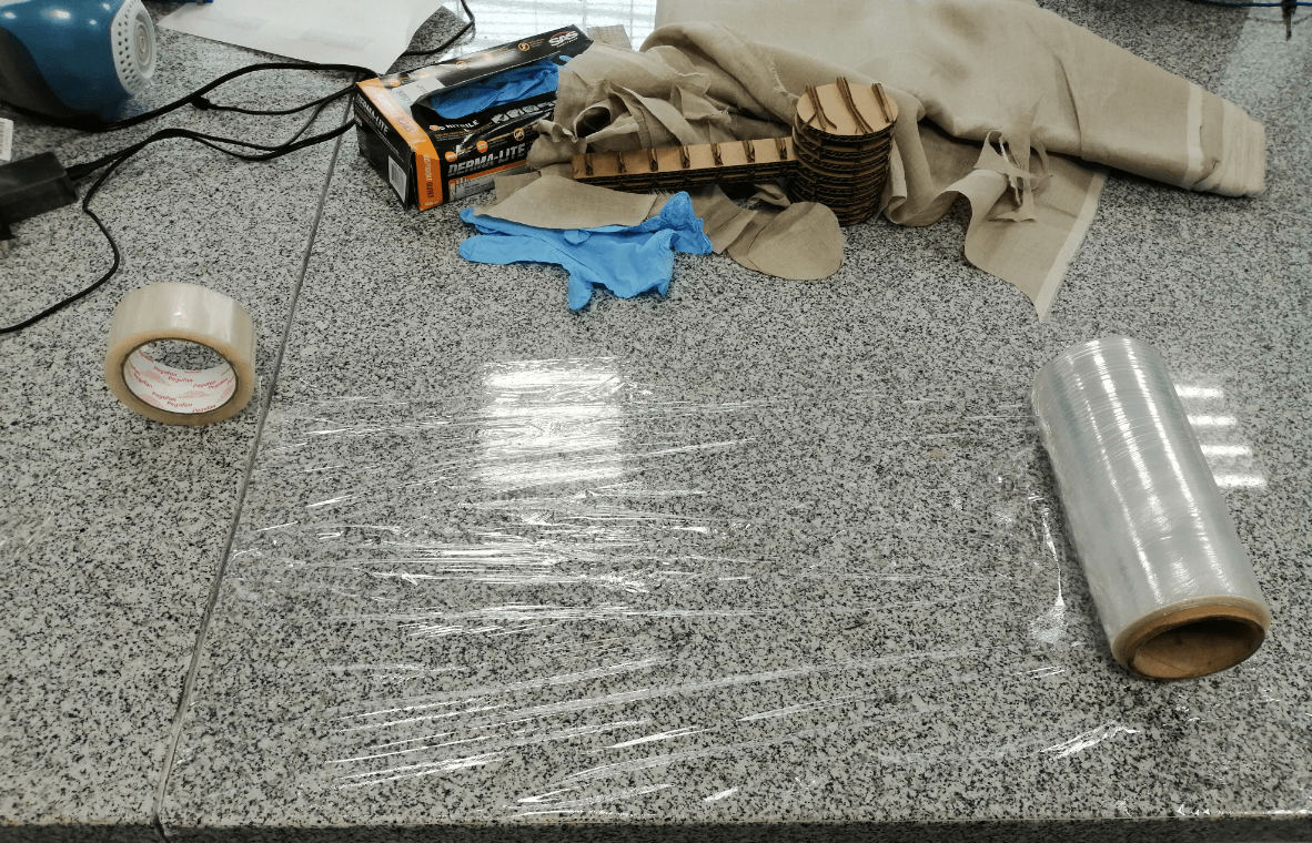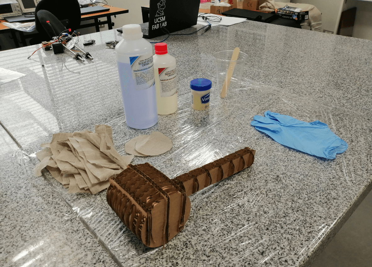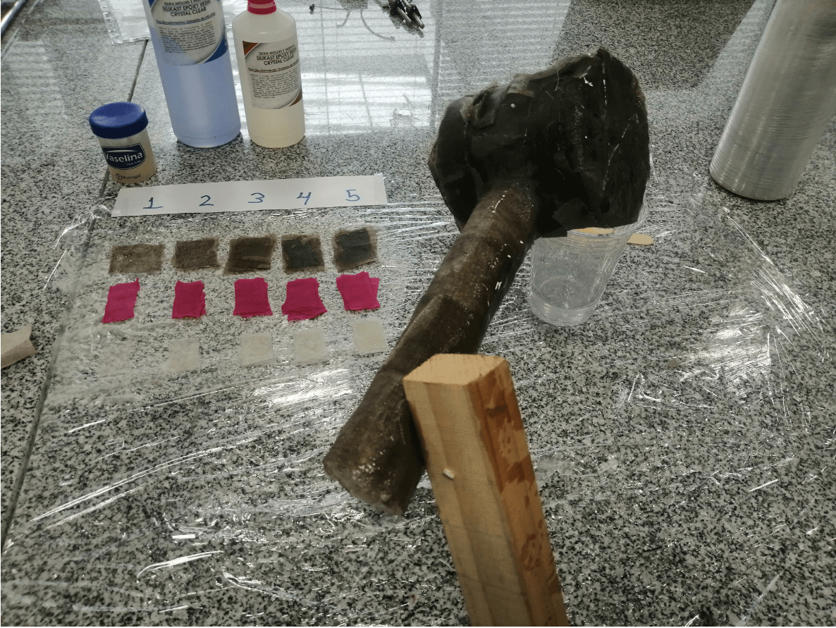 For the group assignment I decided to test the resistance of 3 materials: Cotton, Linen and paper towels. I first cut square pieces from each of the materials listed above and set them up on my workbench, waiting to finish covering my hammer and using the remaining resin. I decided to test from 1 layer to 5 layers in total and then check the properties of each one.