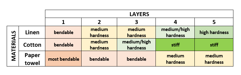 Also testing the tabs with 5 layers of thickness, the result was similar, unlike that the cotton was very stiff, the linen was really solid and the paper towel underneath both materials.